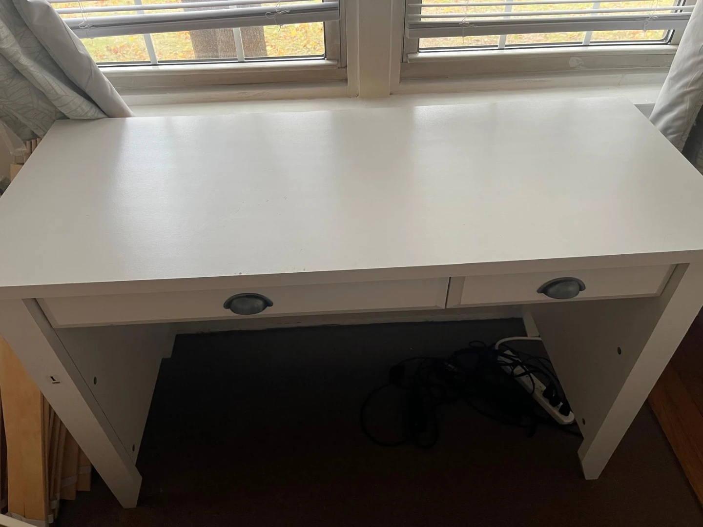 Selling a simple white desk with drawers. It's perfect for a home office or study space. It has a clean look and provides a good surface for working or studying