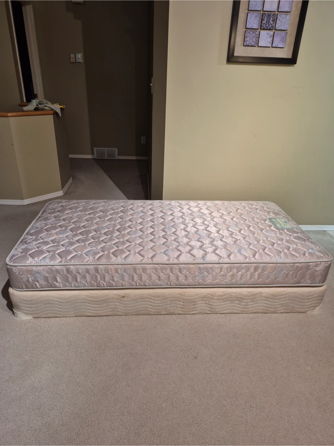 We are giving out used twin mattress and box spring set. There is a sign of wear, but it is in fine condition. It is free and pick up only. Feel free to contact me about the details.