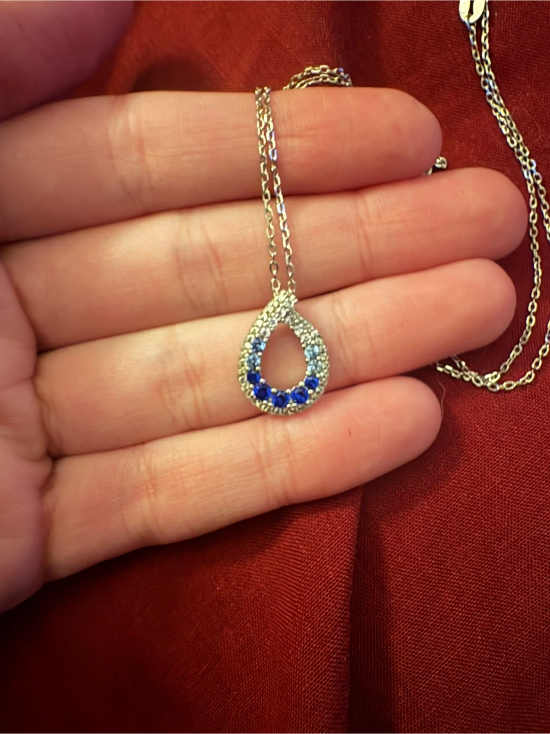 A lovely silver-tone necklace featuring a teardrop pendant. The pendant is adorned with blue and clear stones in a gradient design. The chain is thin and delicate.