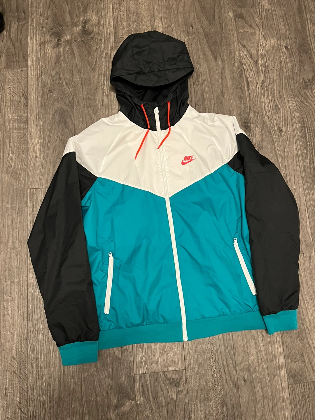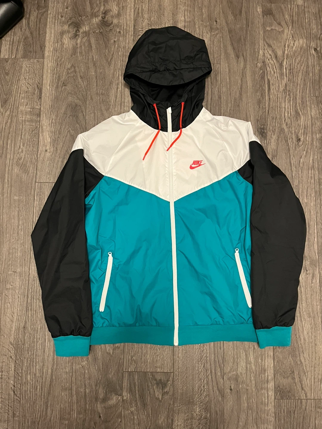 Selling a Nike Windrunner jacket in excellent condition! It's a size L with a black, white, and teal colour scheme. Perfect for layering or wearing on its own during those breezy days!