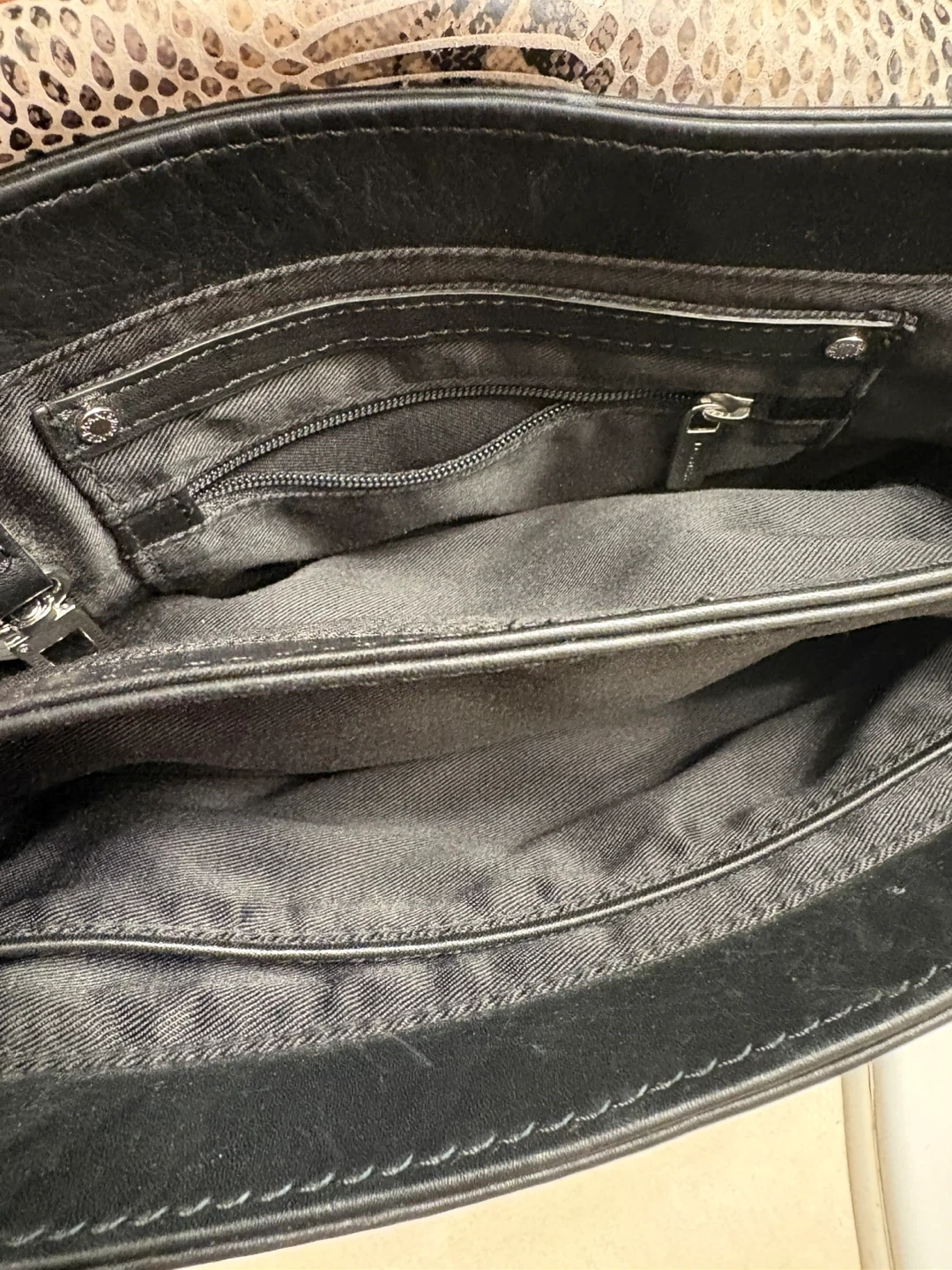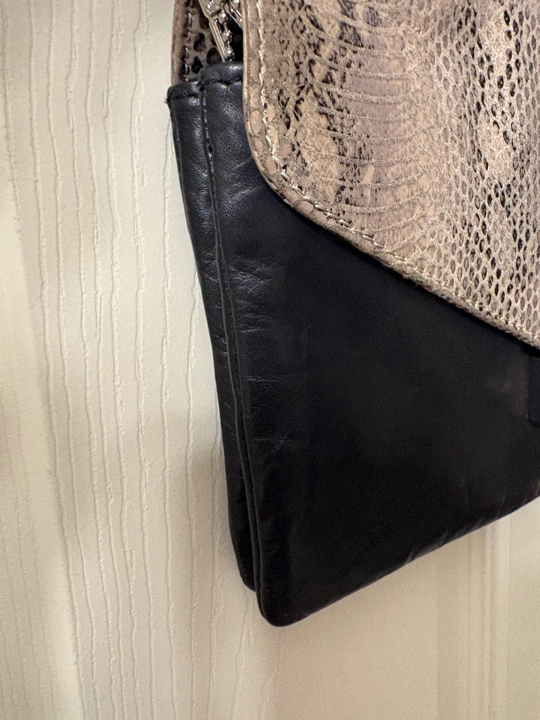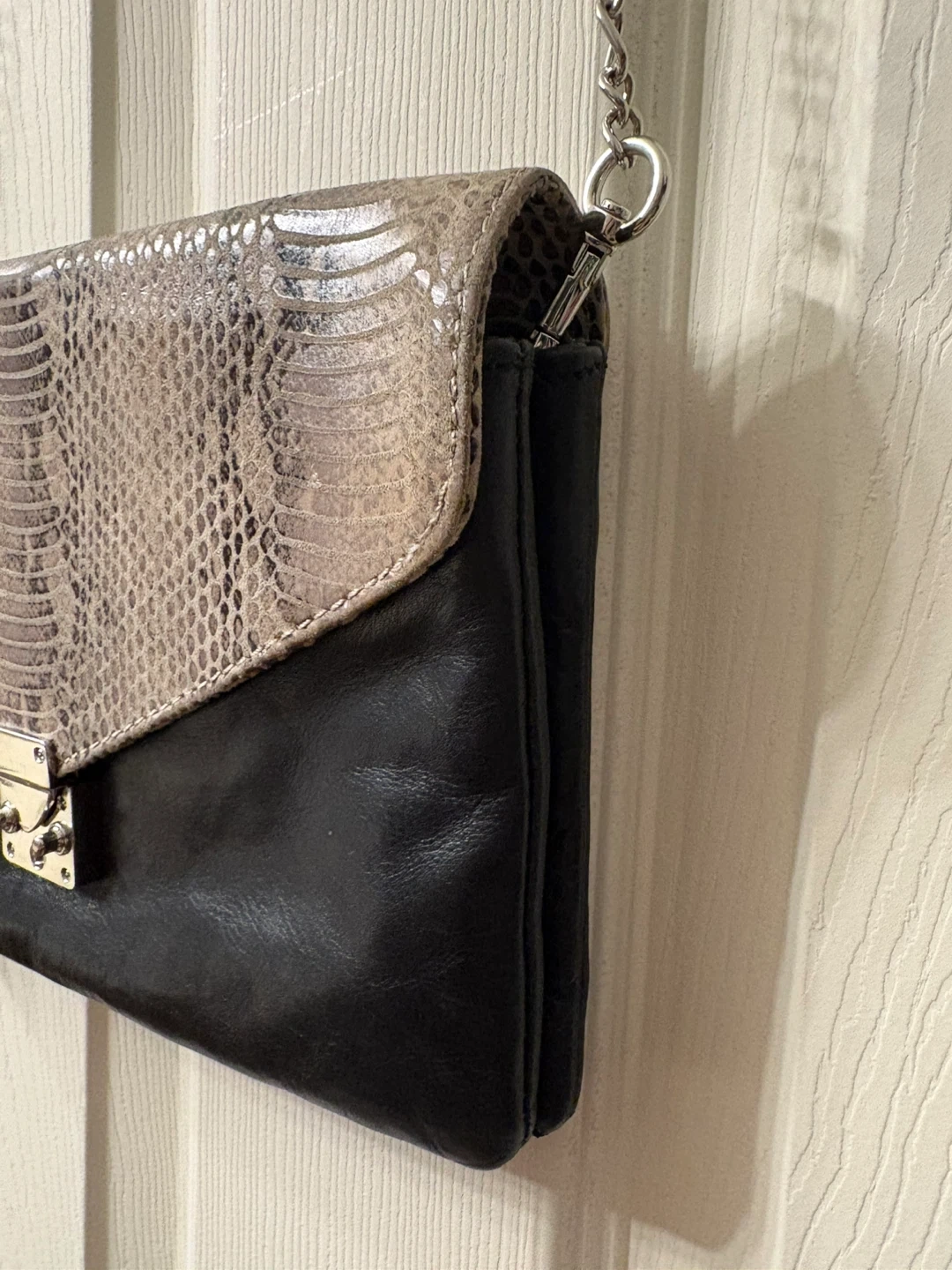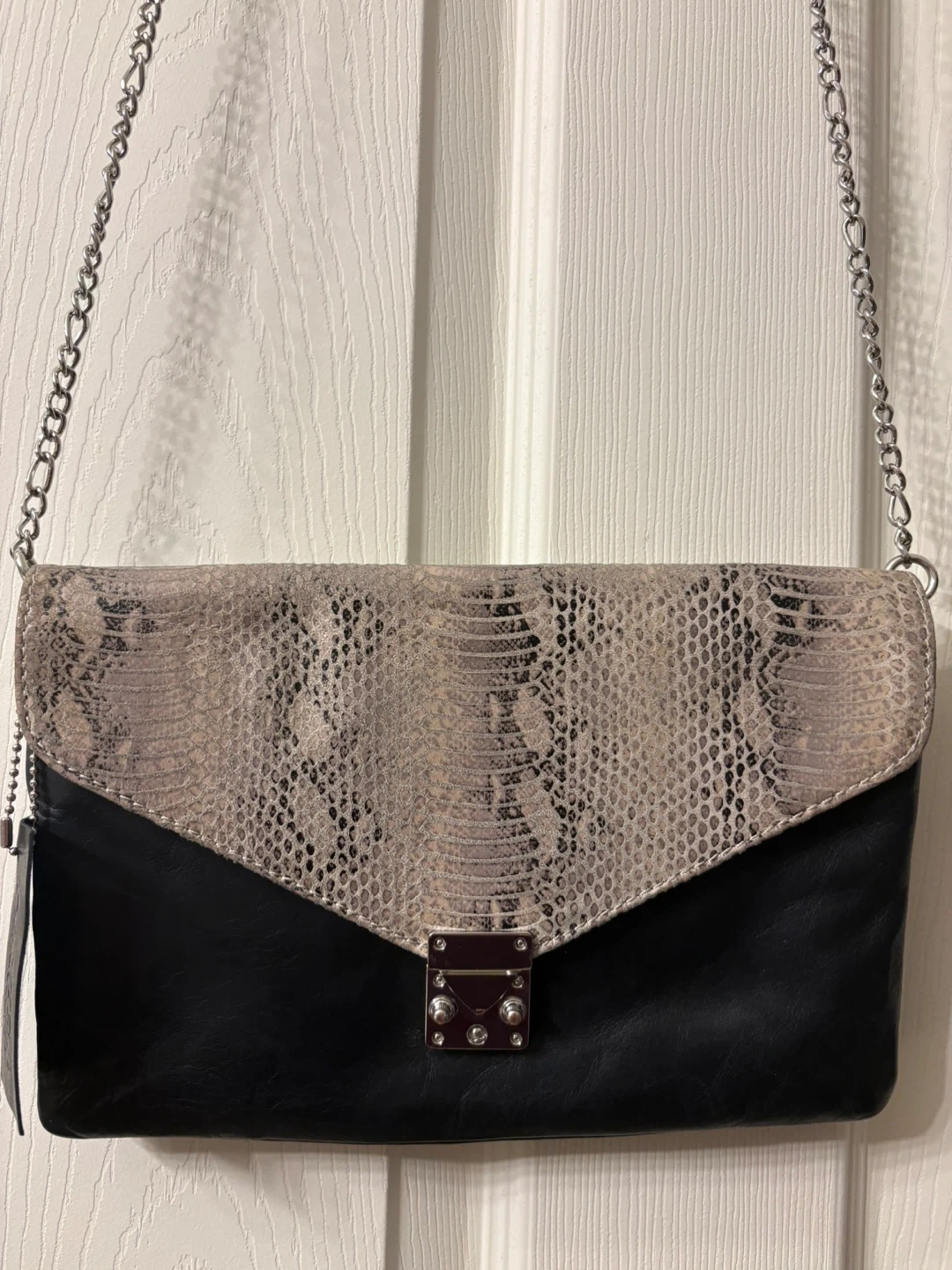 This DANIER clutch purse features a stylish black base with a textured snake print flap. It comes with a silver chain strap for versatile wear. Genuine leather. Perfect “like new” condition! Small elegant bag that fits a lot! Pick up in Chestermere.