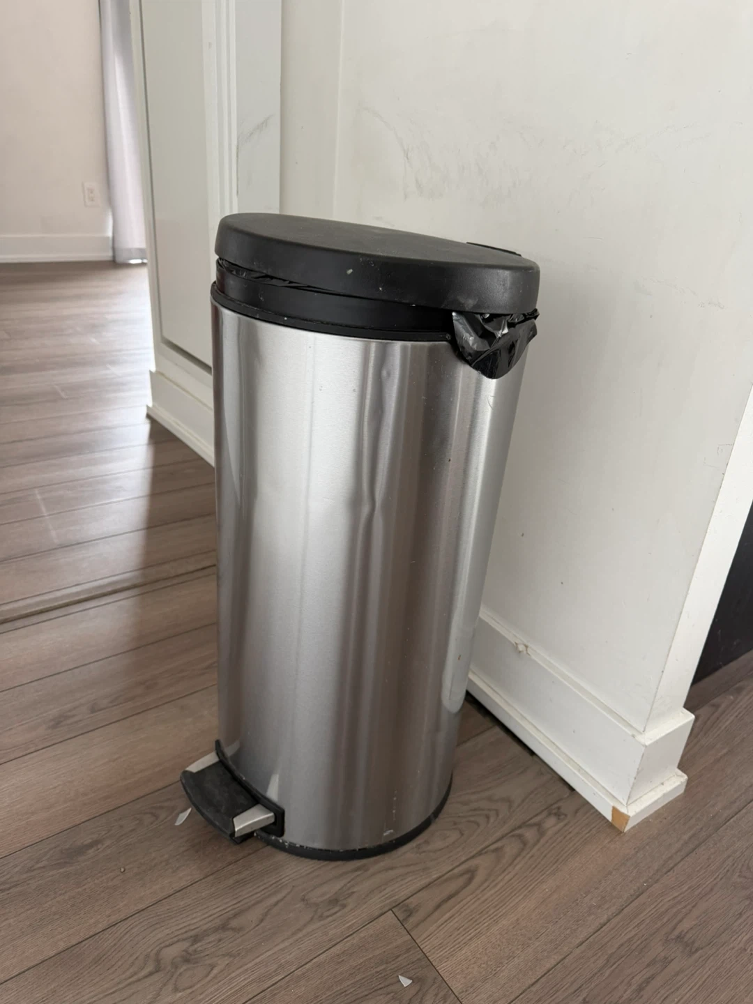 This is a stainless steel step trash can. It has a removable black lid and a foot pedal for hands-free operation. The bin is made of brushed stainless steel for a modern look.