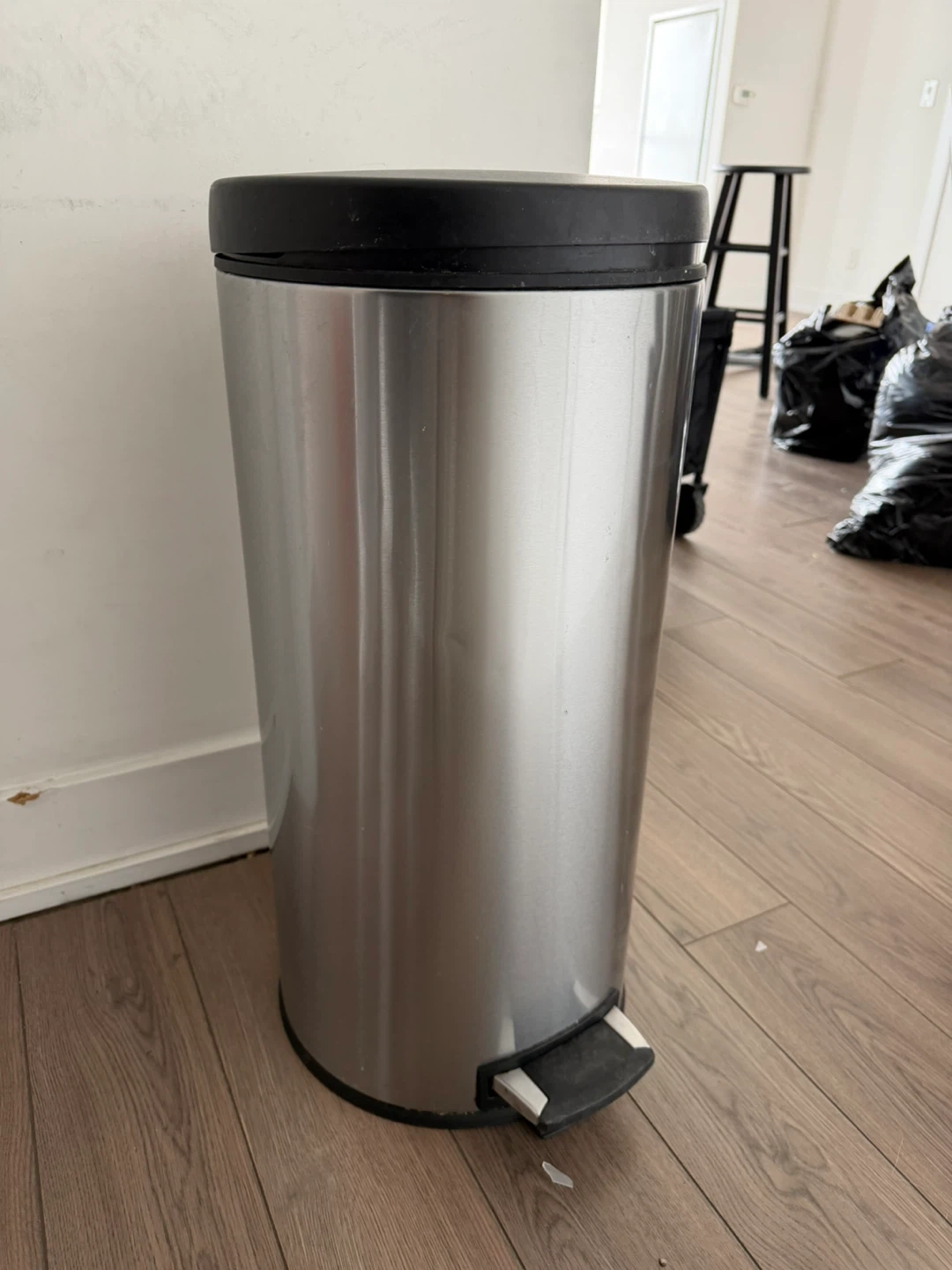 This is a stainless steel step trash can. It has a removable black lid and a foot pedal for hands-free operation. The bin is made of brushed stainless steel for a modern look.