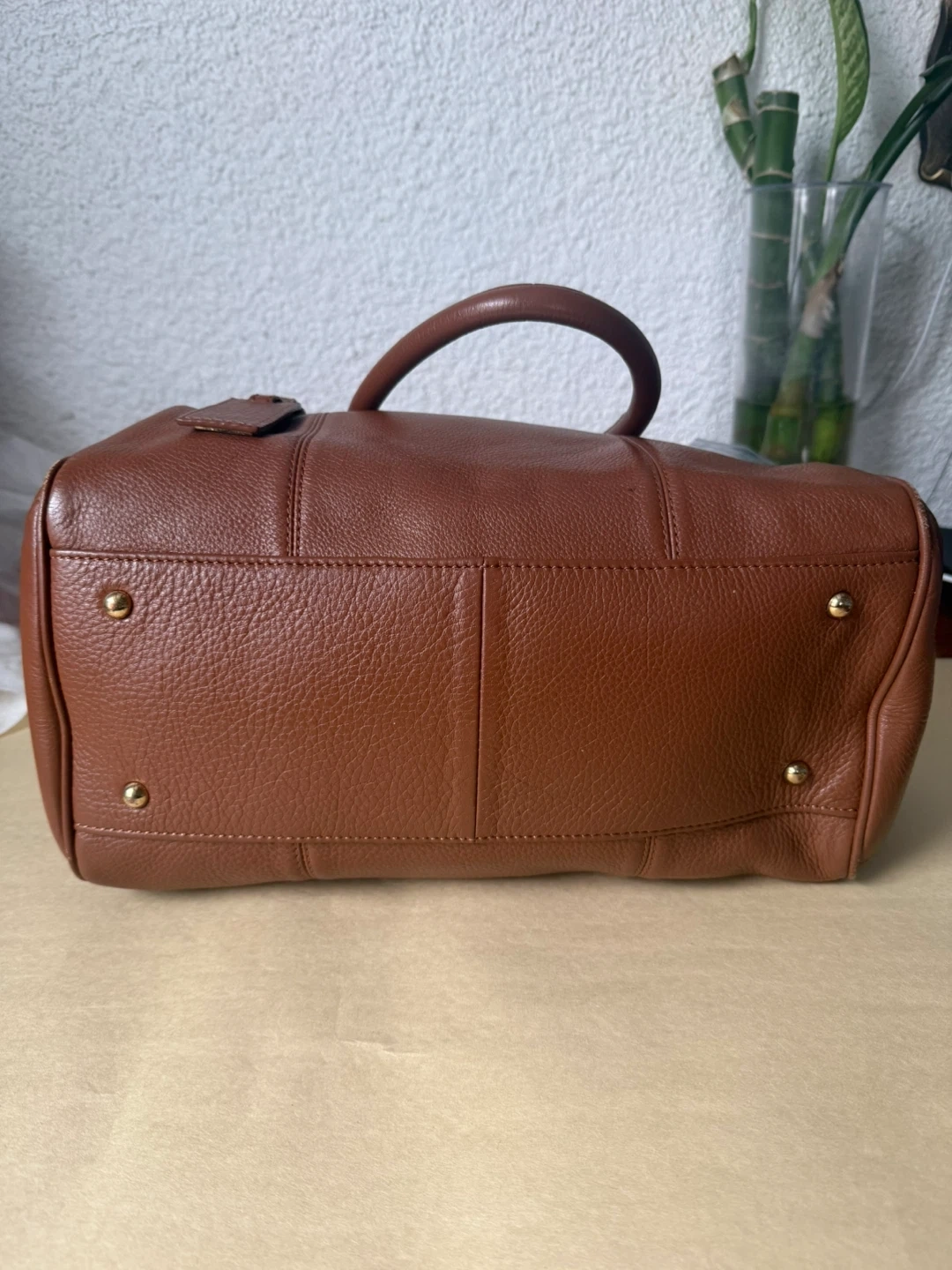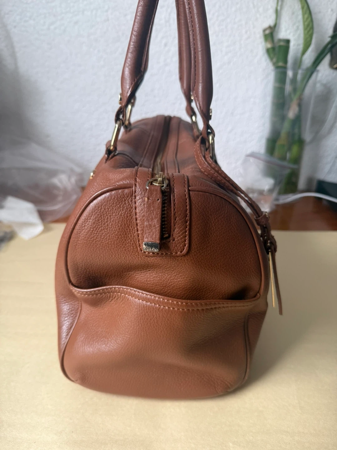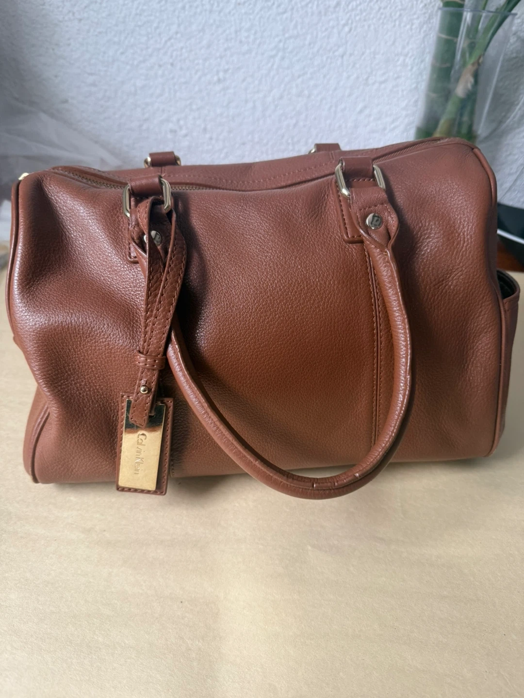 This stylish Calvin Klein satchel handbag is crafted from genuine brown leather. It features a zippered main compartment and an exterior zip pocket for easy access to your essentials. This bag is perfect for everyday use, offering both fashion and function.