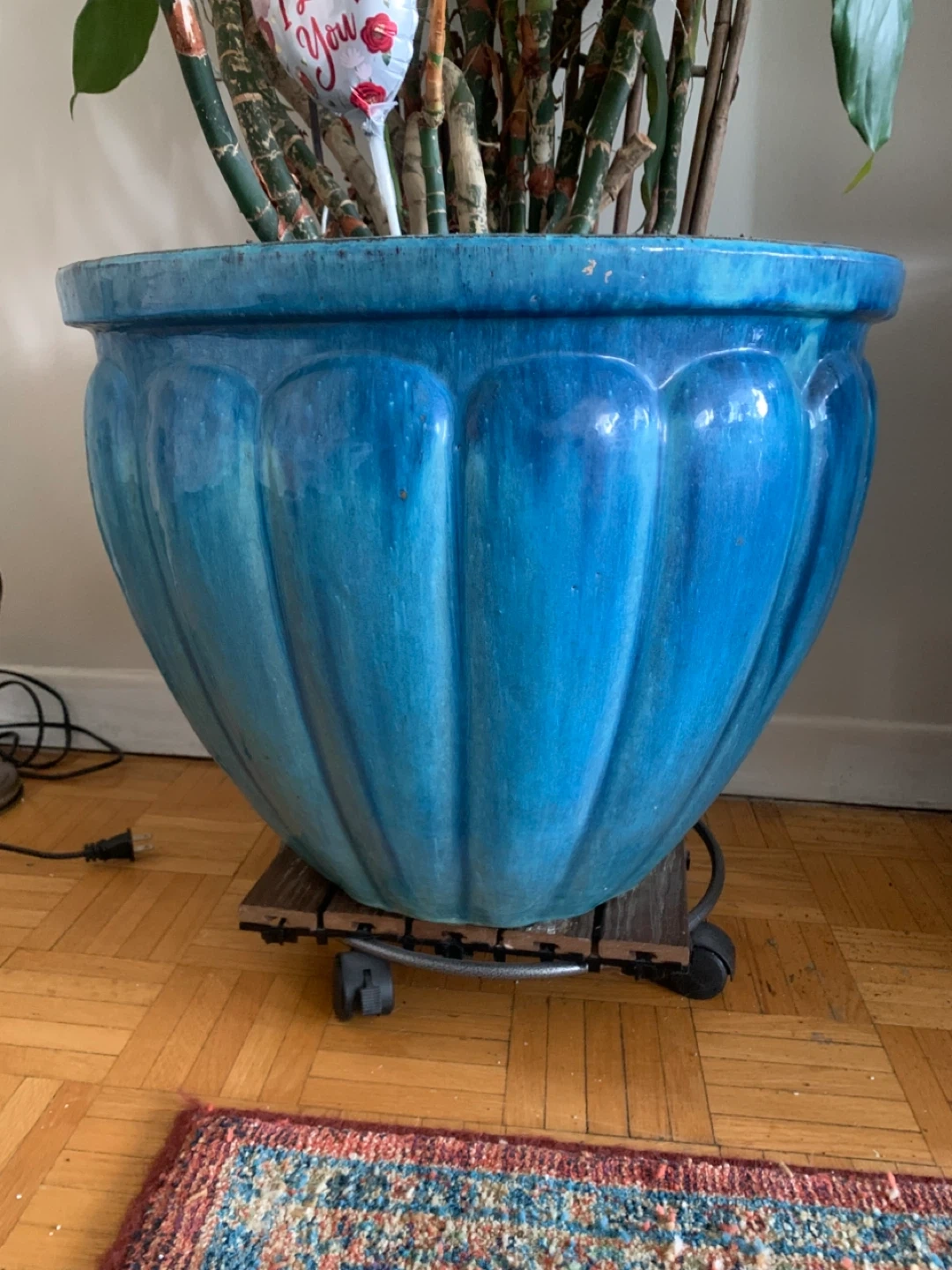 There are 2 of these large, beautiful blue ceramic planter. It's in great condition and ready to add a pop of colour to your space. The planter is sitting on a wheeled base for easy moving. 1 $35 both $60