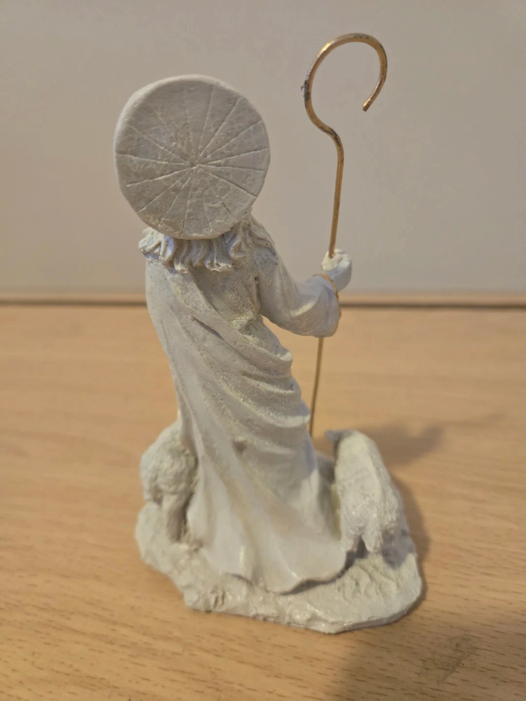This unique figurine is crafted from the actual volcanic ash from the 1991 eruption of Mt. Pinatubo in the Philippines. It depicts a figure holding a lamb and a shepherd's crook. A special piece for collectors or those interested in unique materials!