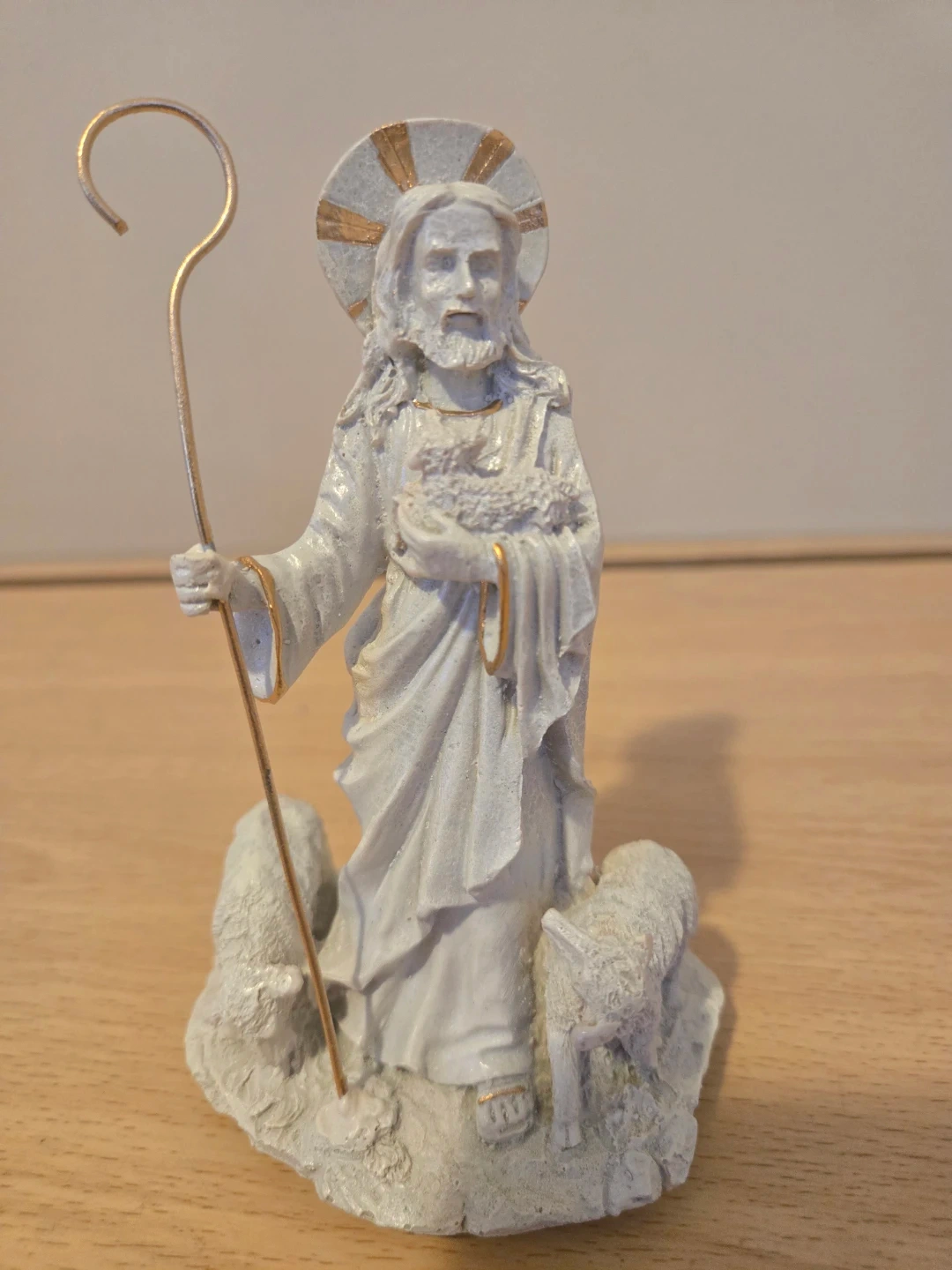 This unique figurine is crafted from the actual volcanic ash from the 1991 eruption of Mt. Pinatubo in the Philippines. It depicts a figure holding a lamb and a shepherd's crook. A special piece for collectors or those interested in unique materials!