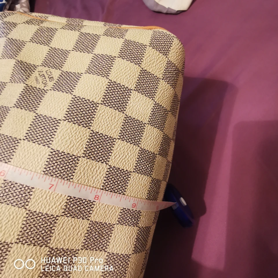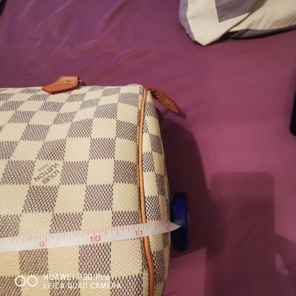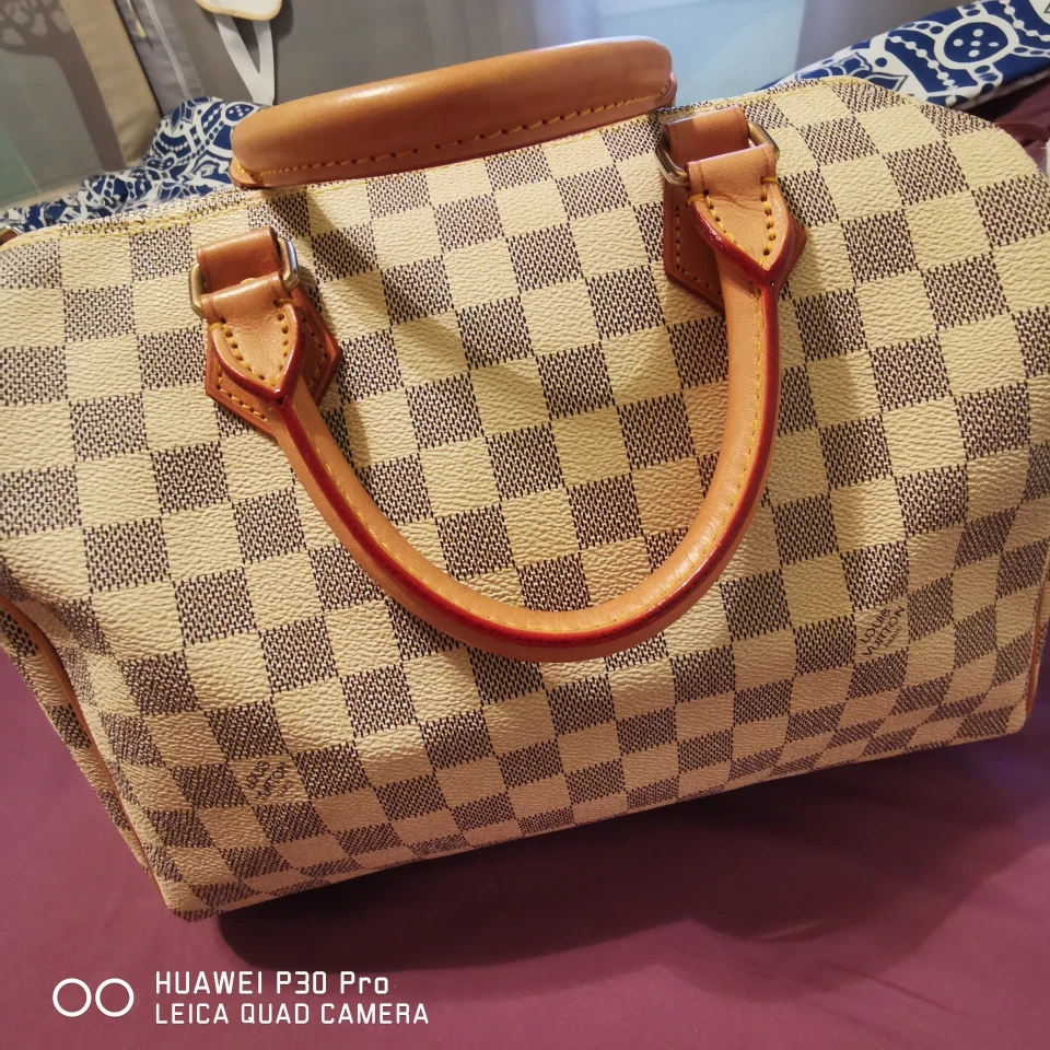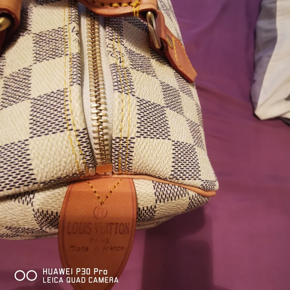 Checkered pattern exterior. Leather handles and accents. Zipper closure. Great for carrying essentials throughout your day. not coded, in excellent condition inside is clean