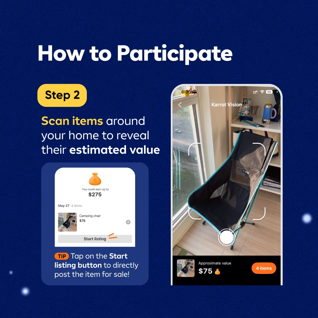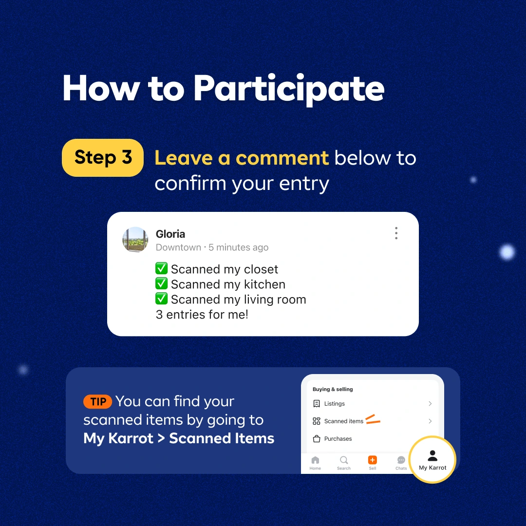 1000+Ahoy Karroters! Join us this week for a little Treasure Hunt game! Say hello to faster, easier, and smarter selling with our brand new AI-powered scanning feature - Karrot Vision 😉 This week, every corner of your home becomes a hidden trove. There's treasure waiting to be found and listed 🌟 When: June 3 - 9 PRIZES UP FOR GRABS: 💎 $500 Amazon gift card for 1 grand prize winner 💎 $10 Amazon gift card for 100 winners 🏆 BONUS: $50 Amazon gift card for 10 winners who share a story of their Karrot Vision experience on Instagram (must tag @karrot.canada) HOW TO PARTICIPATE: ✨ Use "Karrot Vision" to see what your stuff's worth✨ Scan items from your... ✅ Living Room ✅ Kitchen Area ✅ Office Space ✅ Bedroom ✅ Closet ✅ Basement ✅ Garage 1 Entry per task / room completed. You can receive up to 7 entries. Step 1 - Tap on the new scan icon at the top right corner of the home page Step 2 - Scan items around your home to reveal their estimated value Step 3 - Leave a comment below to confirm your entry 🥕 TIP: You can find your scanned items by going to "My Karrot > Scanned Items". Make sure you've updated the app to the latest version in order to see the "Scanned Items" tab. Winners will be announced on June 10. Don’t let your hidden gems collect dust. Join the Karrot Treasure Hunt today and see what riches you’ve been sitting on! 🏴☠️🔍 Terms & Conditions - All scanned items will be counted. Items do not need to be posted in order to qualify. - All winners will be chosen randomly from the list of participants. - Scanned listings must follow Karrot’s guidelines and policies. Items scanned or listed in Karrot’s Prohibited Items will be excluded. - Promotion is only available to users in Canada.