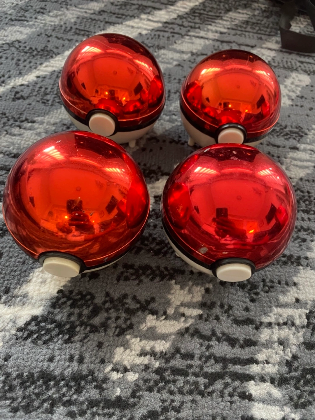 Four red metallic spheres. White bottom. Black ring around the middle. Great for a display in a children's room. Nice for kids to play and get into Pokémon . Open to offers and trades for other stuff