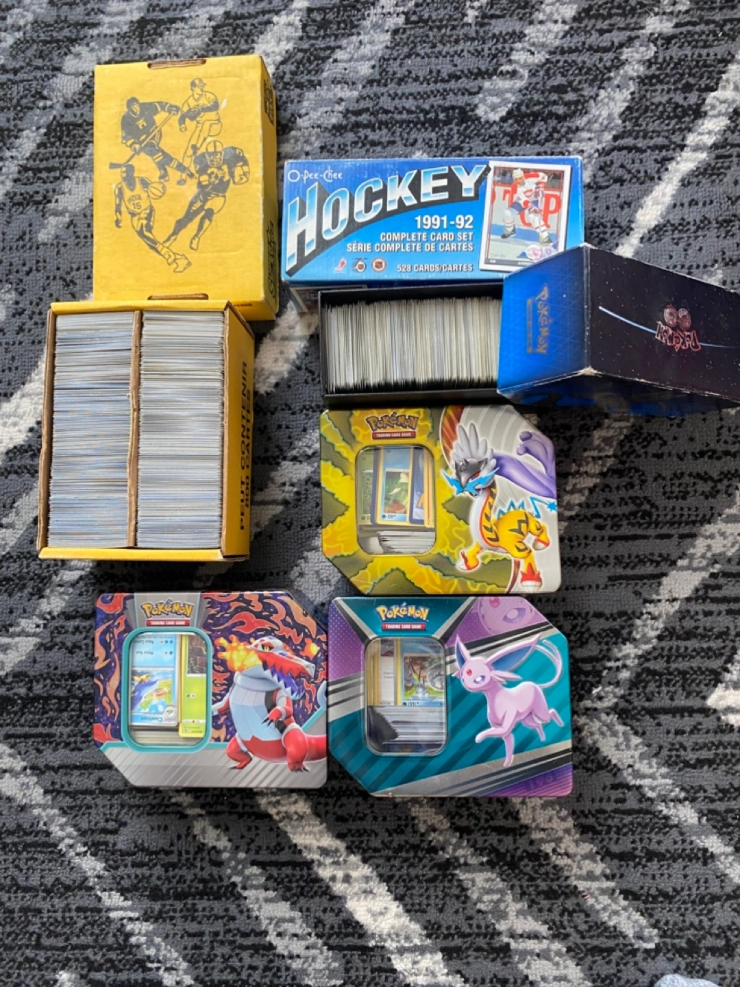 A variety of trading cards and boxes. Several Pokémon trading card tins are included. Also has a hockey card set. This collection is a great way to enjoy a bit of relaxation.