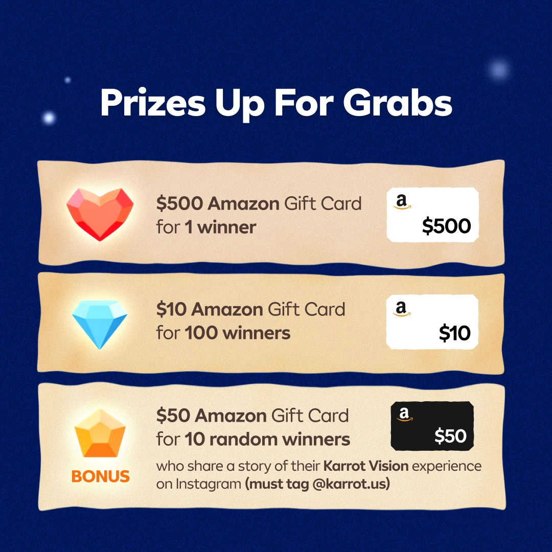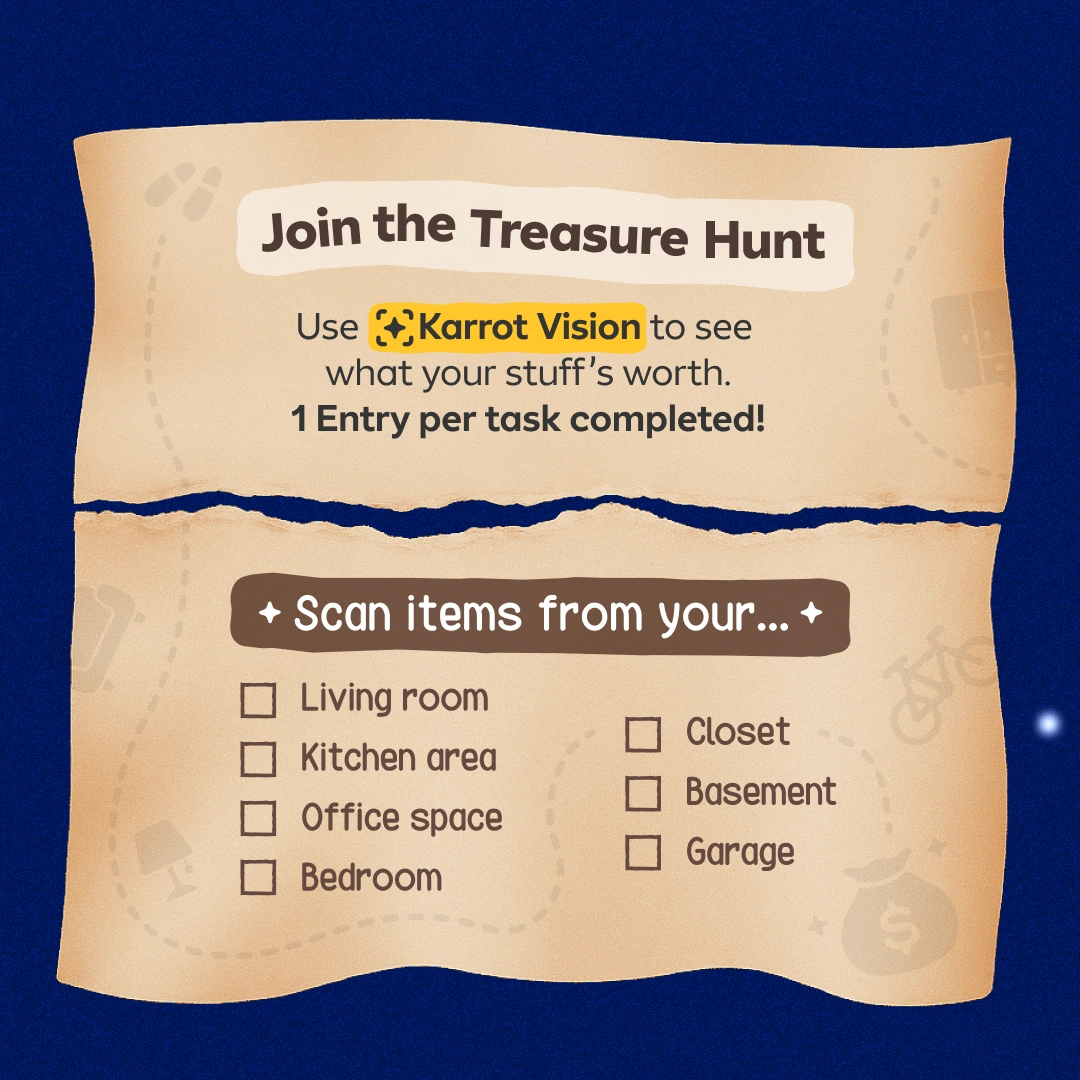 1000+Ahoy Karroters! Join us this week for a little Treasure Hunt game! Say hello to faster, easier, and smarter selling with our brand new AI-powered scanning feature - Karrot Vision 😉 This week, every corner of your home becomes a hidden trove. There's treasure waiting to be found and listed 🌟 When: June 3 - 9 PRIZES UP FOR GRABS: 💎 $500 Amazon gift card for 1 grand prize winner 💎 $10 Amazon gift card for 100 winners 🏆 BONUS: $50 Amazon gift card for 10 winners who share a story of their Karrot Vision experience on Instagram (must tag @karrot.us) HOW TO PARTICIPATE: ✨ Use "Karrot Vision" to see what your stuff's worth✨ Scan items from your... ✅ Living Room ✅ Kitchen Area ✅ Office Space ✅ Bedroom ✅ Closet ✅ Basement ✅ Garage 1 Entry per task / room completed. You can receive up to 7 entries. Step 1 - Tap on the new scan icon at the top right corner of the home page Step 2 - Scan items around your home to reveal their estimated value Step 3 - Leave a comment below to confirm your entry 🥕 TIP: You can find your scanned items by going to "My Karrot > Scanned Items". Make sure you've updated the app to the latest version in order to see the "Scanned Items" tab. Winners will be announced on June 10. Don’t let your hidden gems collect dust. Join the Karrot Treasure Hunt today and see what riches you’ve been sitting on! 🏴☠️🔍 Terms & Conditions - All scanned items will be counted. Items do not need to be posted in order to qualify. - All winners will be chosen randomly from the list of participants. - Scanned listings must follow Karrot’s guidelines and policies. Items scanned or listed in Karrot’s Prohibited Items will be excluded. - Promotion is only available to users in the US.