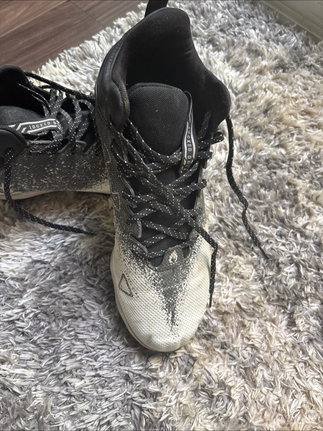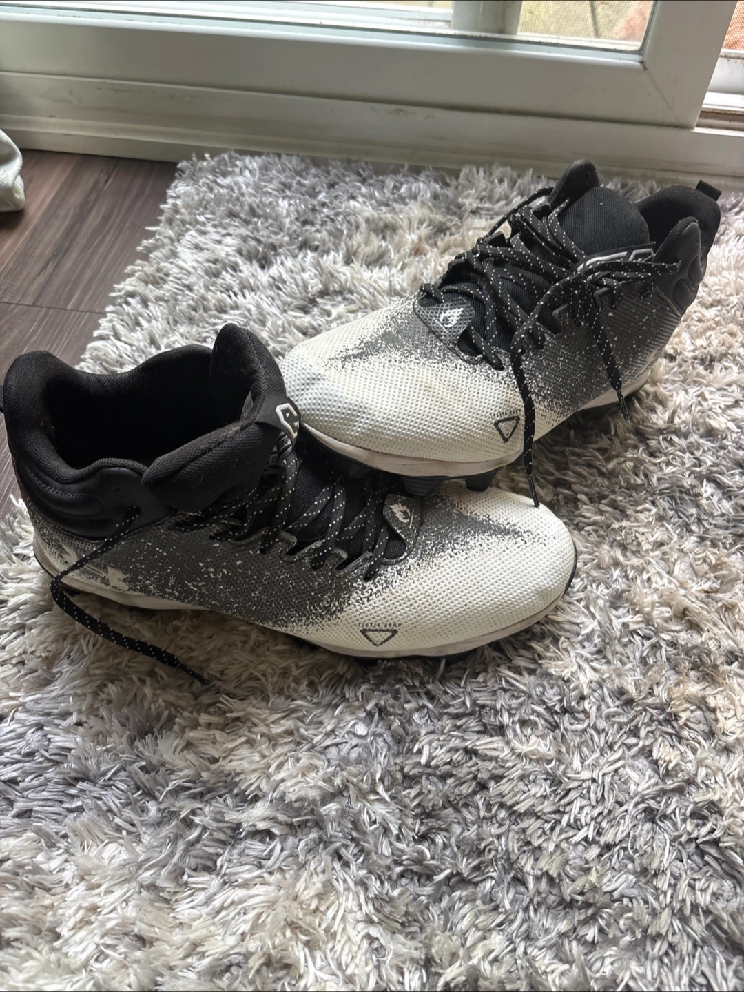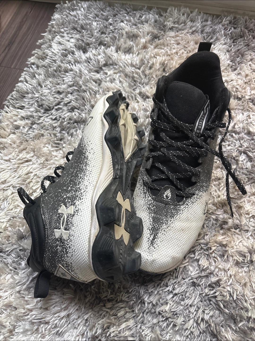 Under Armour Dr scholls sz 11.5 Football Cleats Black and white football cleats. Cleats are on the bottom. The laces are patterned. These cleats would be great to wear on the field.
