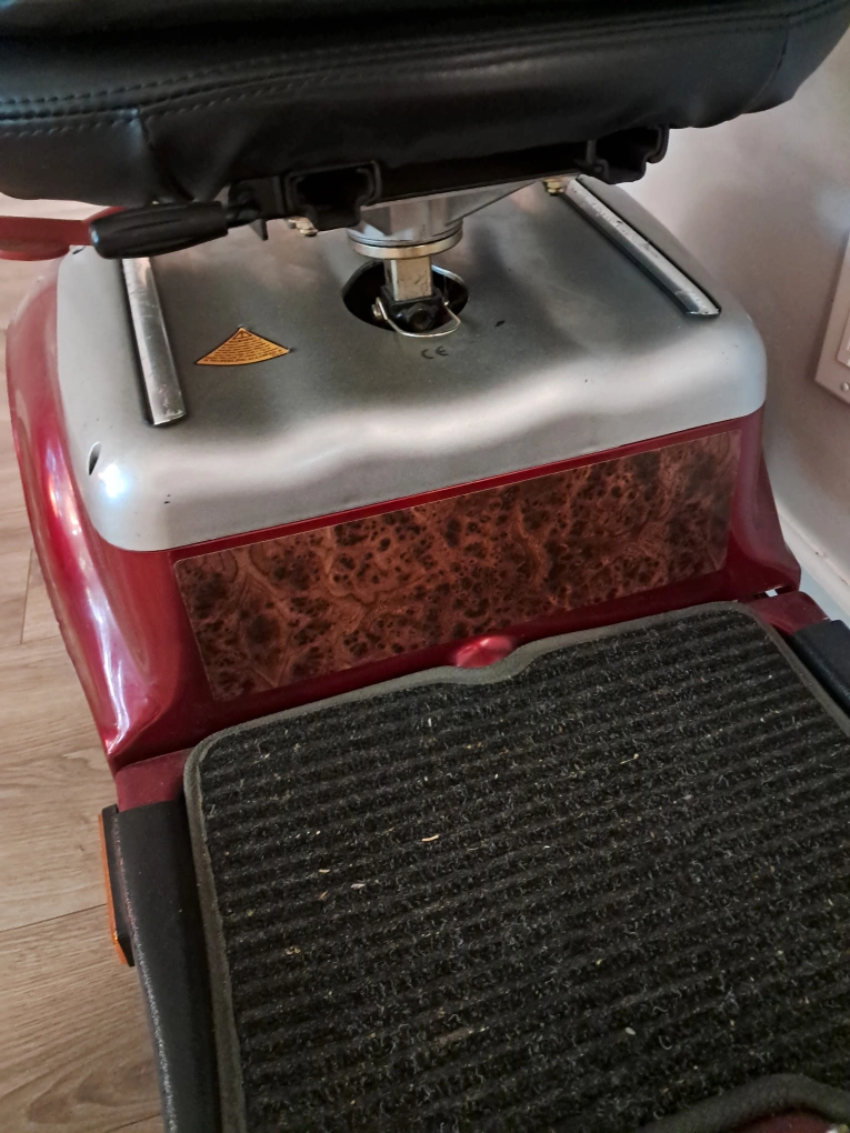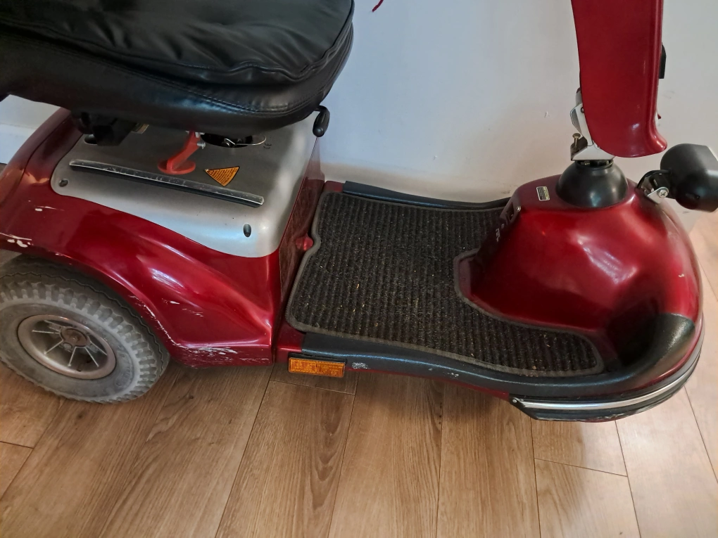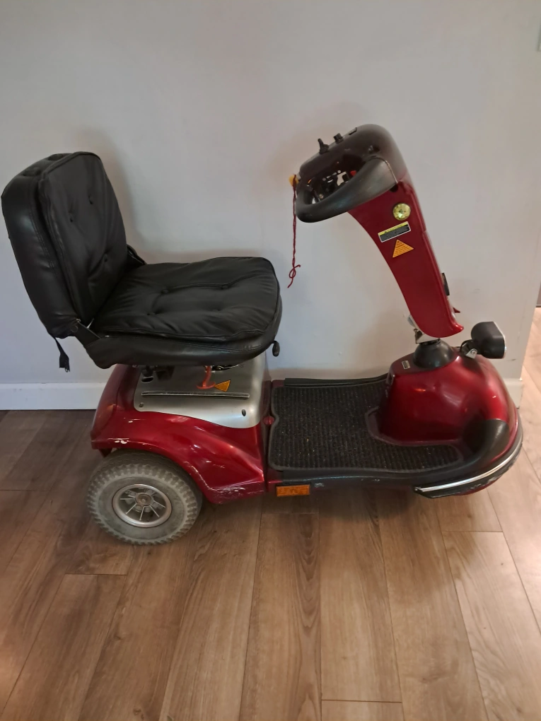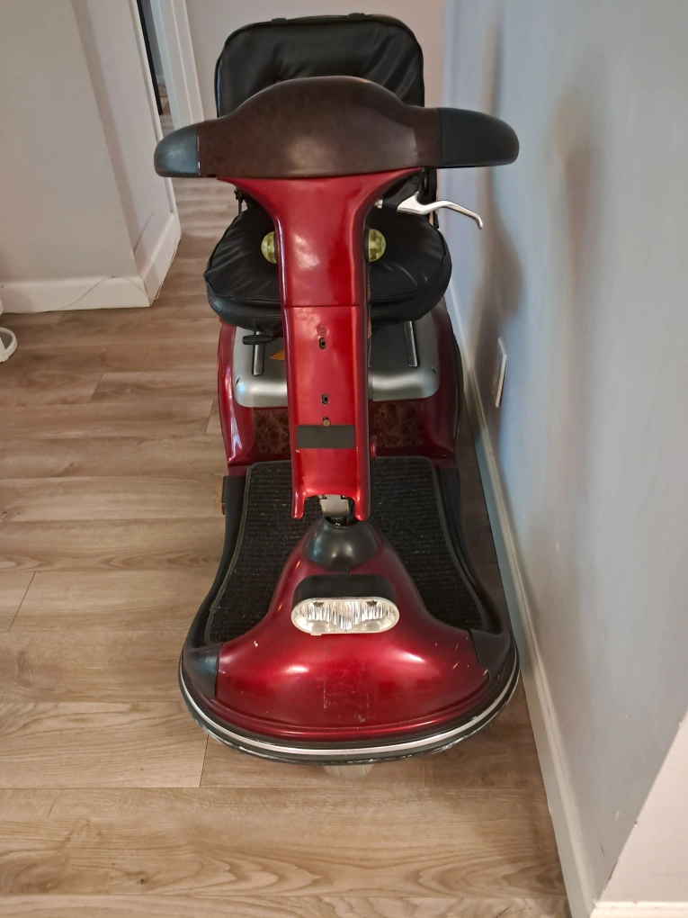 A personal mobility scooter. The scooter has a black seat with a black padded back. It also has a dark red body with a silver trim. These scooters allow for easy access in places where walking may be difficult, for anyone who may need it.