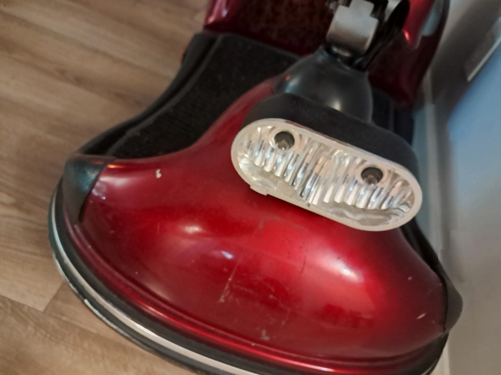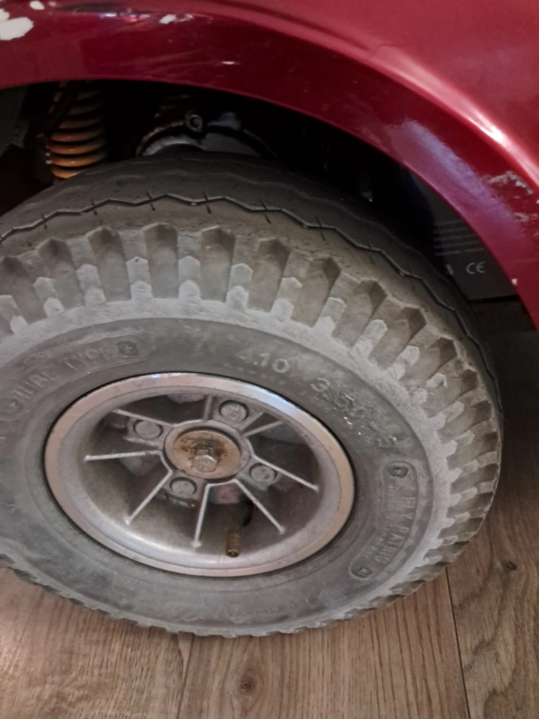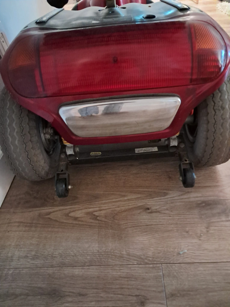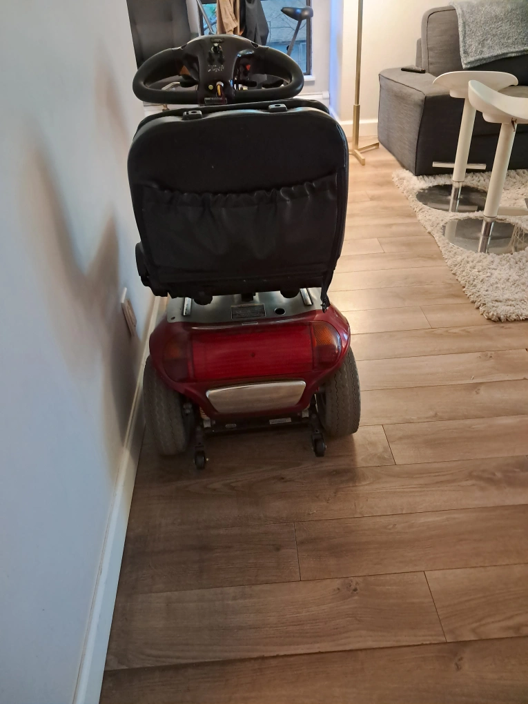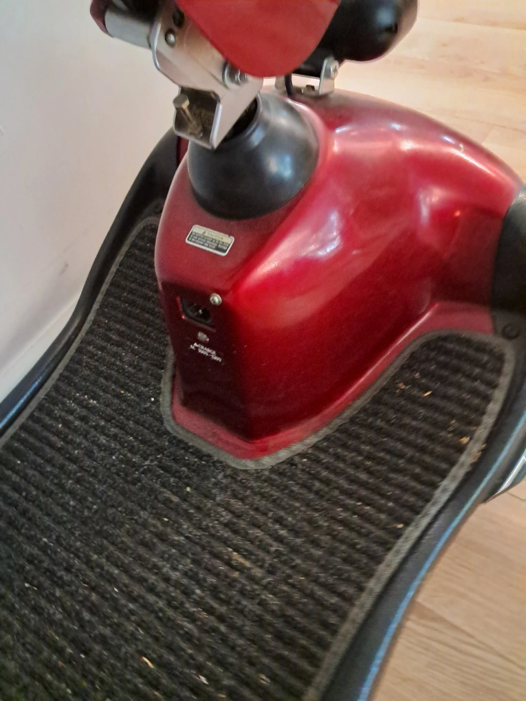 A personal mobility scooter. The scooter has a black seat with a black padded back. It also has a dark red body with a silver trim. These scooters allow for easy access in places where walking may be difficult, for anyone who may need it.