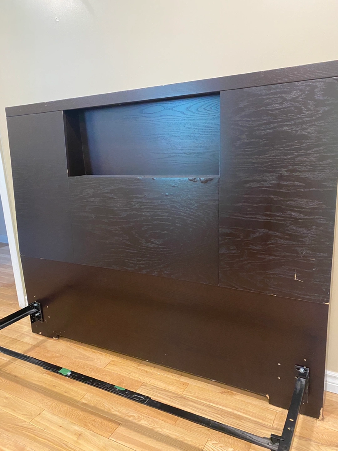 Selling this dark-colored queen headboard and adjustable metal bed frame. The headboard is solid, sturdy, while the frame easily adjusts to fit your mattress needs. Clean, modern look that complements any décor.