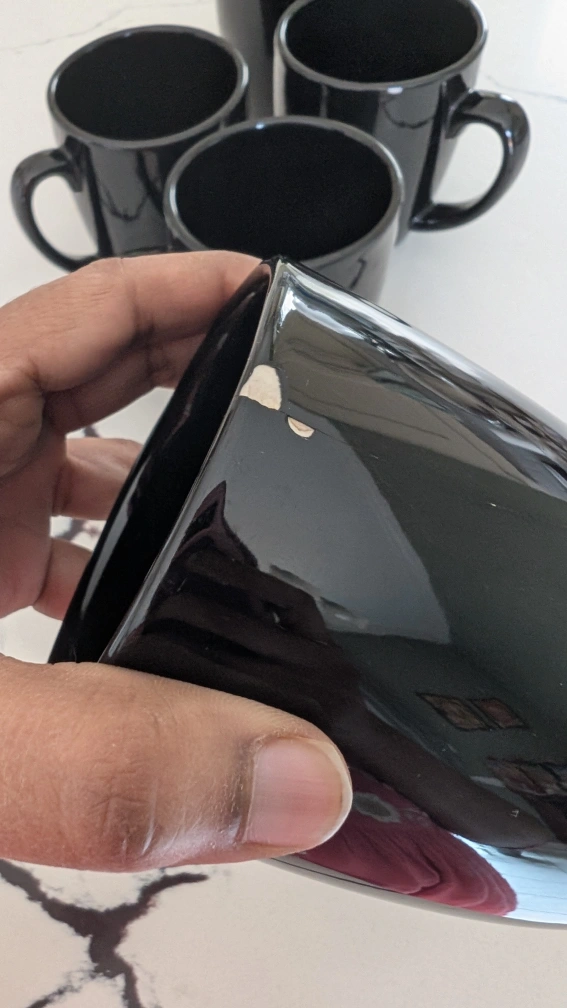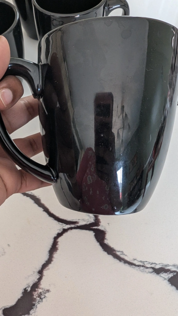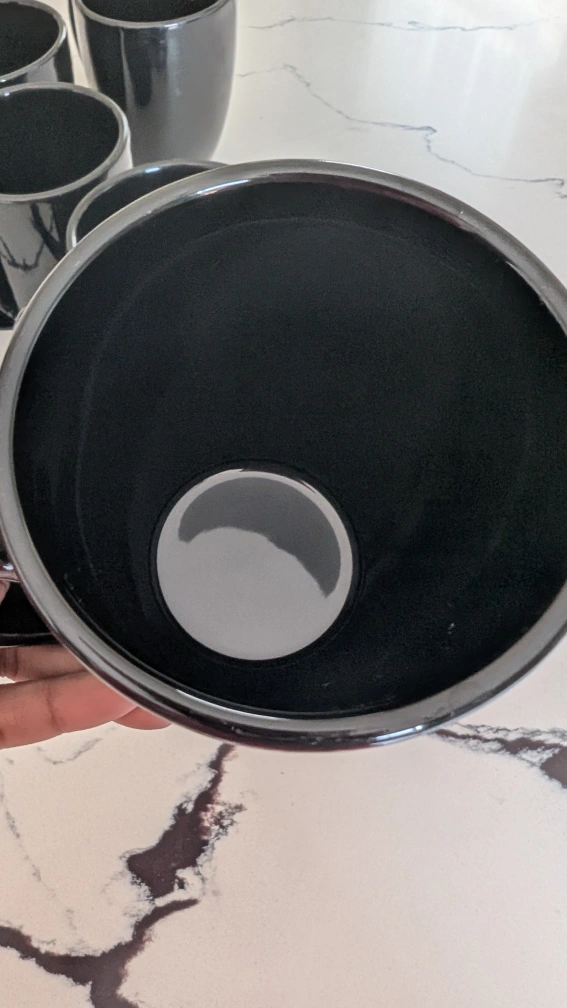 A set of five shiny black mugs. The mugs have a wide, rounded shape. Handles are attached for easy gripping. You can use them to enjoy your coffee in peace.