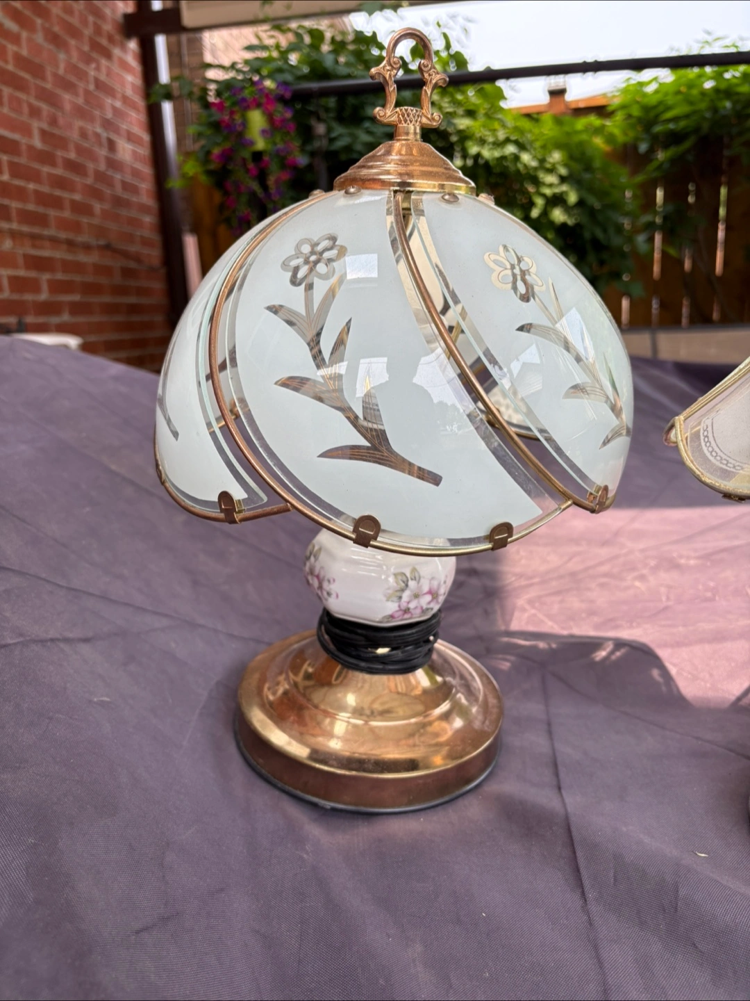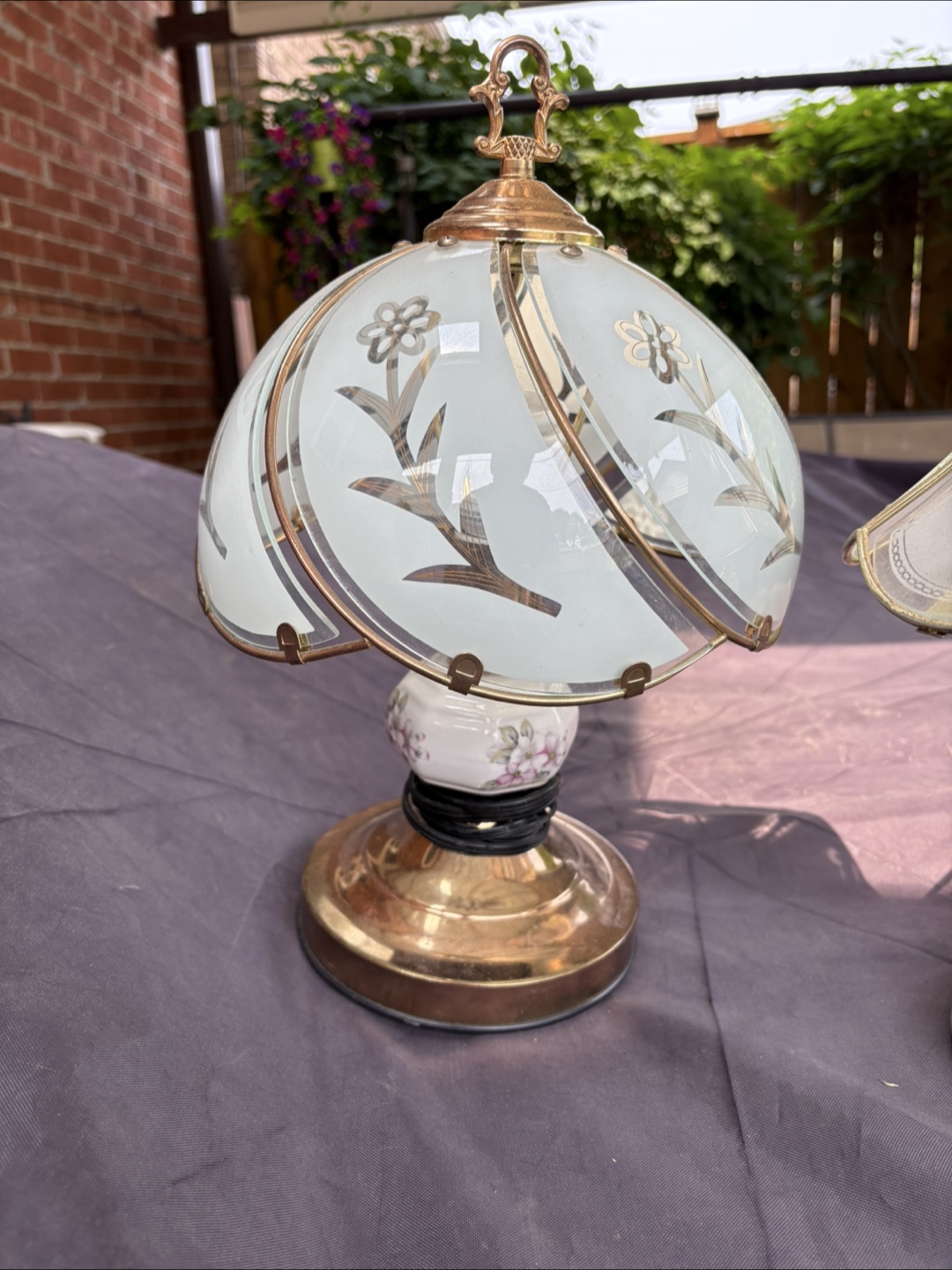 Two gorgeous touch table lamps. White, floral-decorated shades. Gold-toned bases. These lamps will add a warm glow to any space, helping you relax.