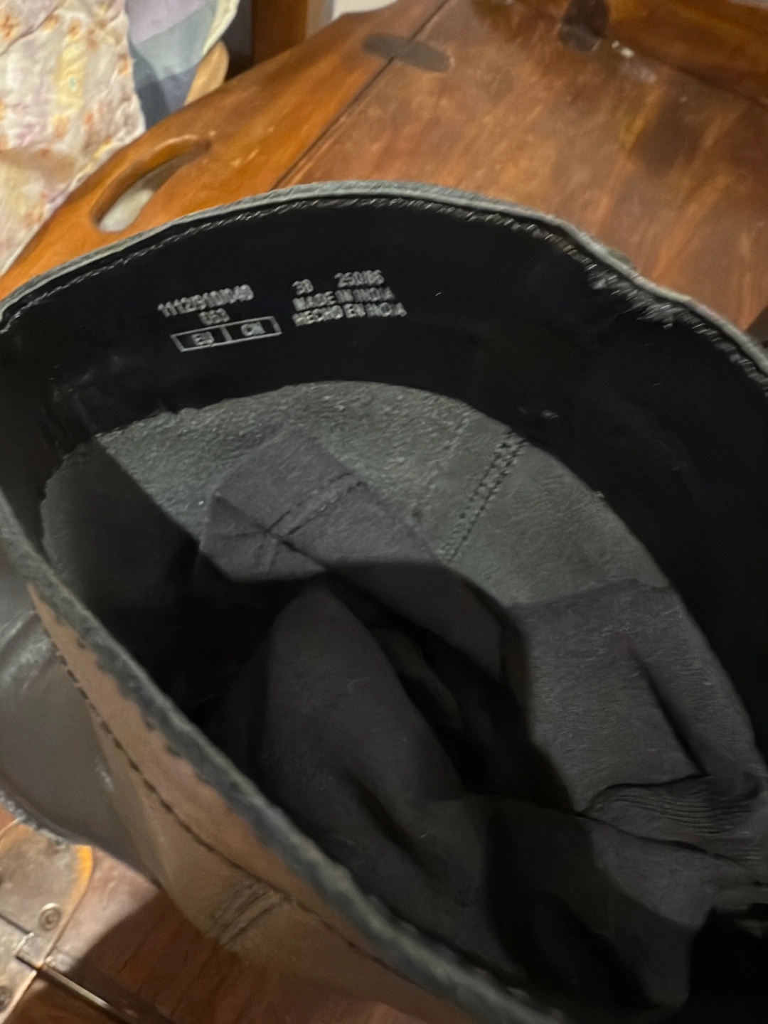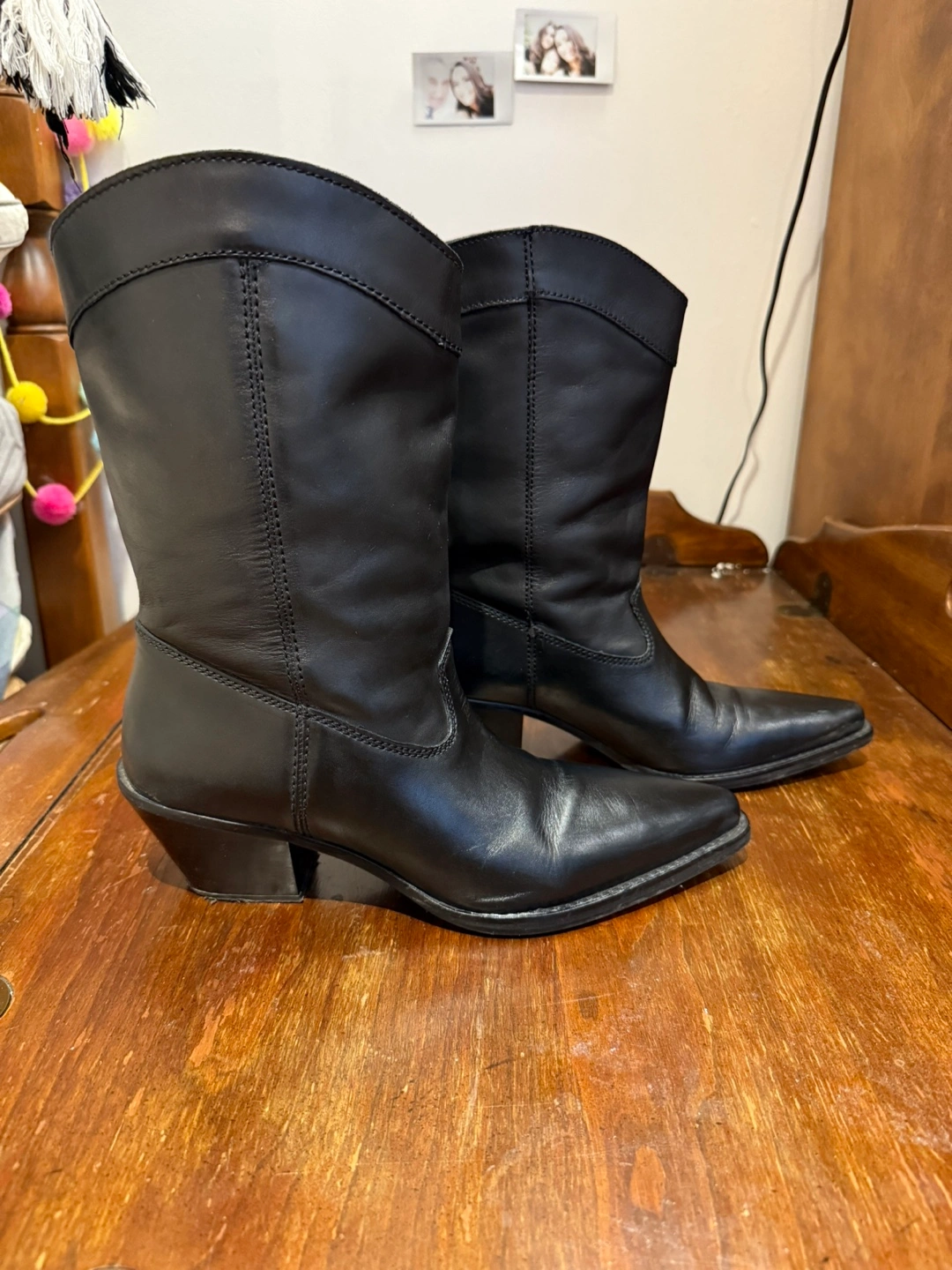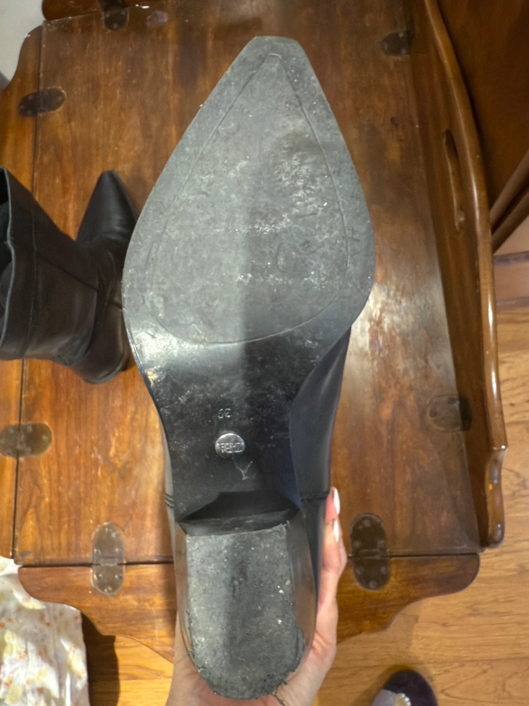 Black leather boots. Pointed toe. Mid-calf height. Low heel. The soft feel of the leather is soothing. These are perfect for walking around the city.