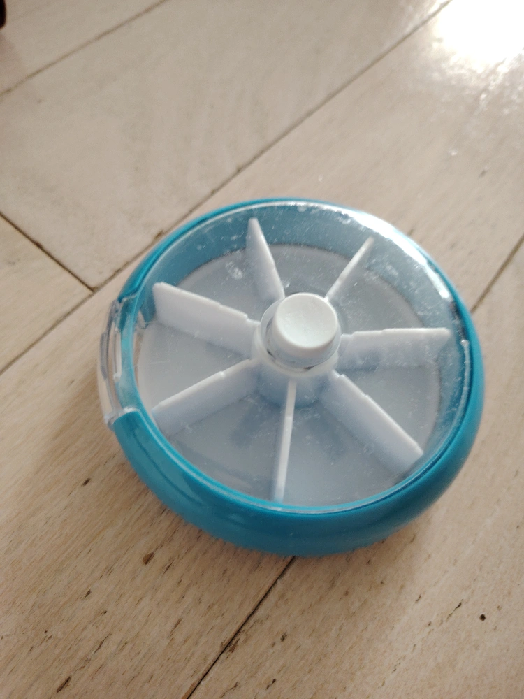 A turquoise round pill organizer. It has several compartments. The lid is clear and the organizer is plastic. It's a great way to keep your pills neatly organized for each day of the week.