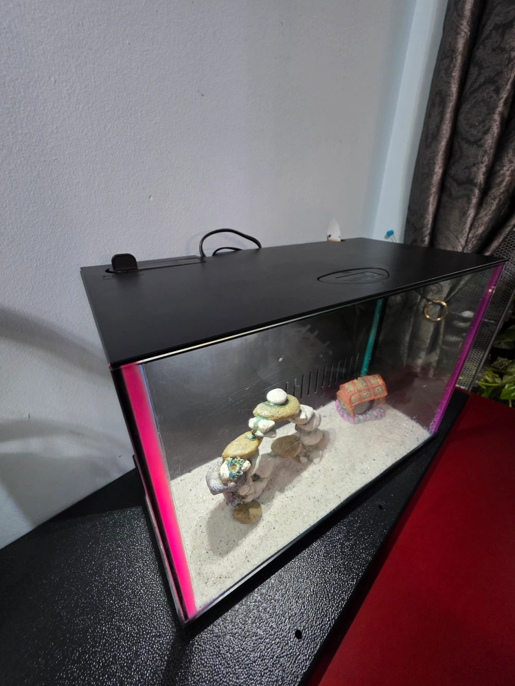A beautiful fish tank. Features a black top and sides. A variety of decorations inside. Fill it with water and watch your fish swim around calmly.3 gallon
