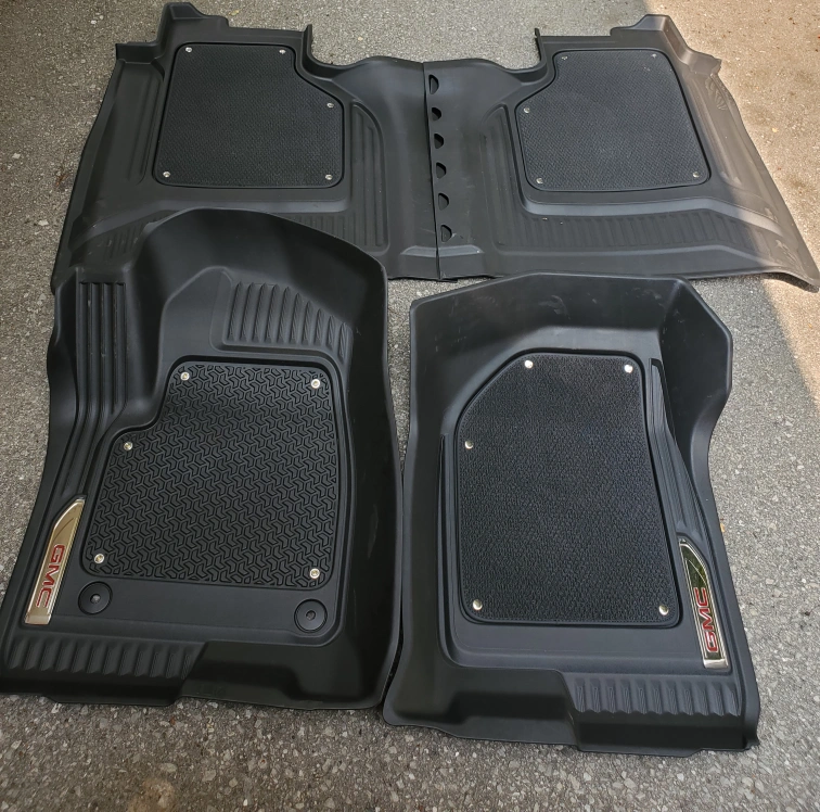 71Genuine GM: Rear Floor Mat Set: Fits 2019- 2024 GM GMC TRUCKS Complete with Silver "GMC Edition" Emblem on the two front. OEM: FRONT MATTS 84511310 BACK FLOOR MATTS 84590967 Carpet Sections "unsnap" for Winter and muddy boot use as well as easy cleaning. Missing on carpet section on front driver Matt. Pickup dufferin and Steeles area