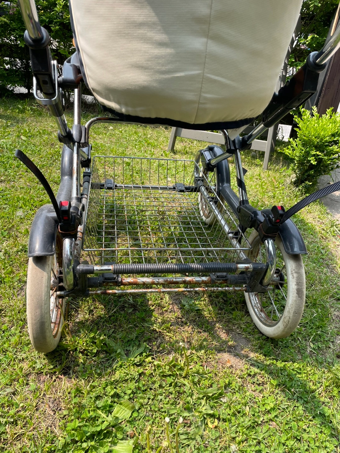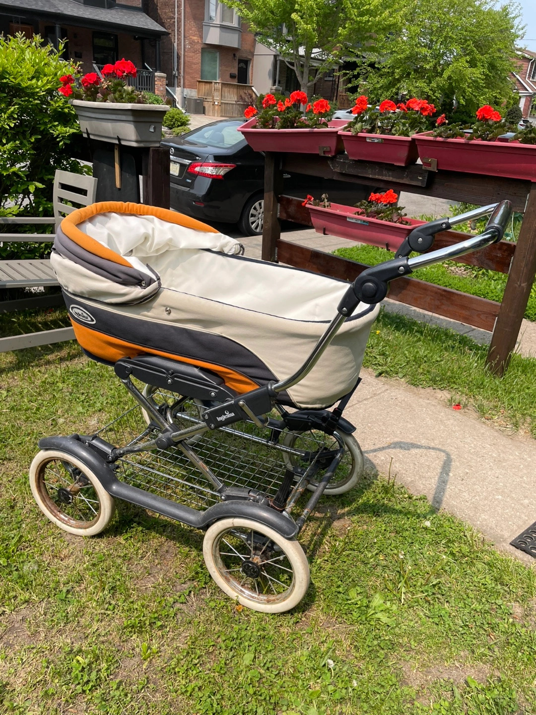 This stroller offers a comfortable and spacious basinet as well as a sturdy frame with a practical storage basket underneath. It is used but well maintained, has been used during the wintertime for a couple months and is easy to use anywhere with its big wheels.