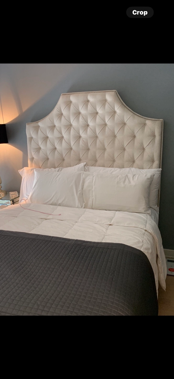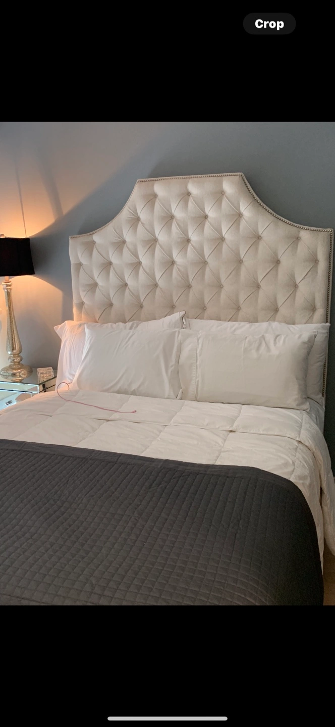 260A gorgeous headboard with button tufting. The headboard features a curved top with nailhead trim. The upholstery appears to be a light neutral tone. This would be a perfect addition for a peaceful retreat.