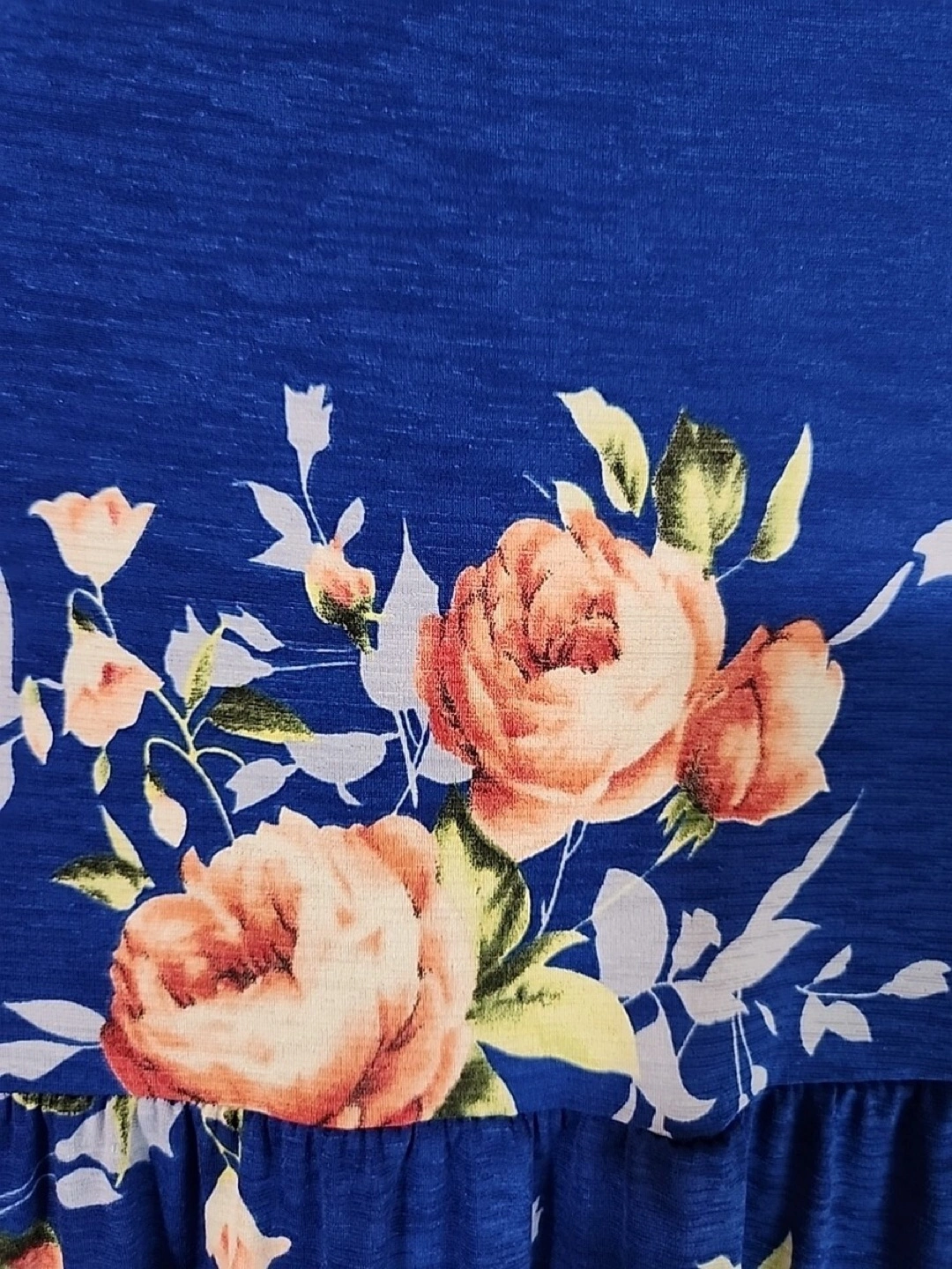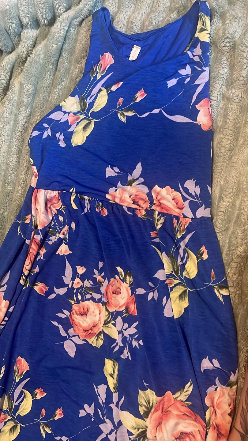 80A stunning blue maxi dress, perfect for those warm, summer days. Features a floral pattern, with a fitted bodice. Made of a soft material. You could wear this dress on a relaxing day out.