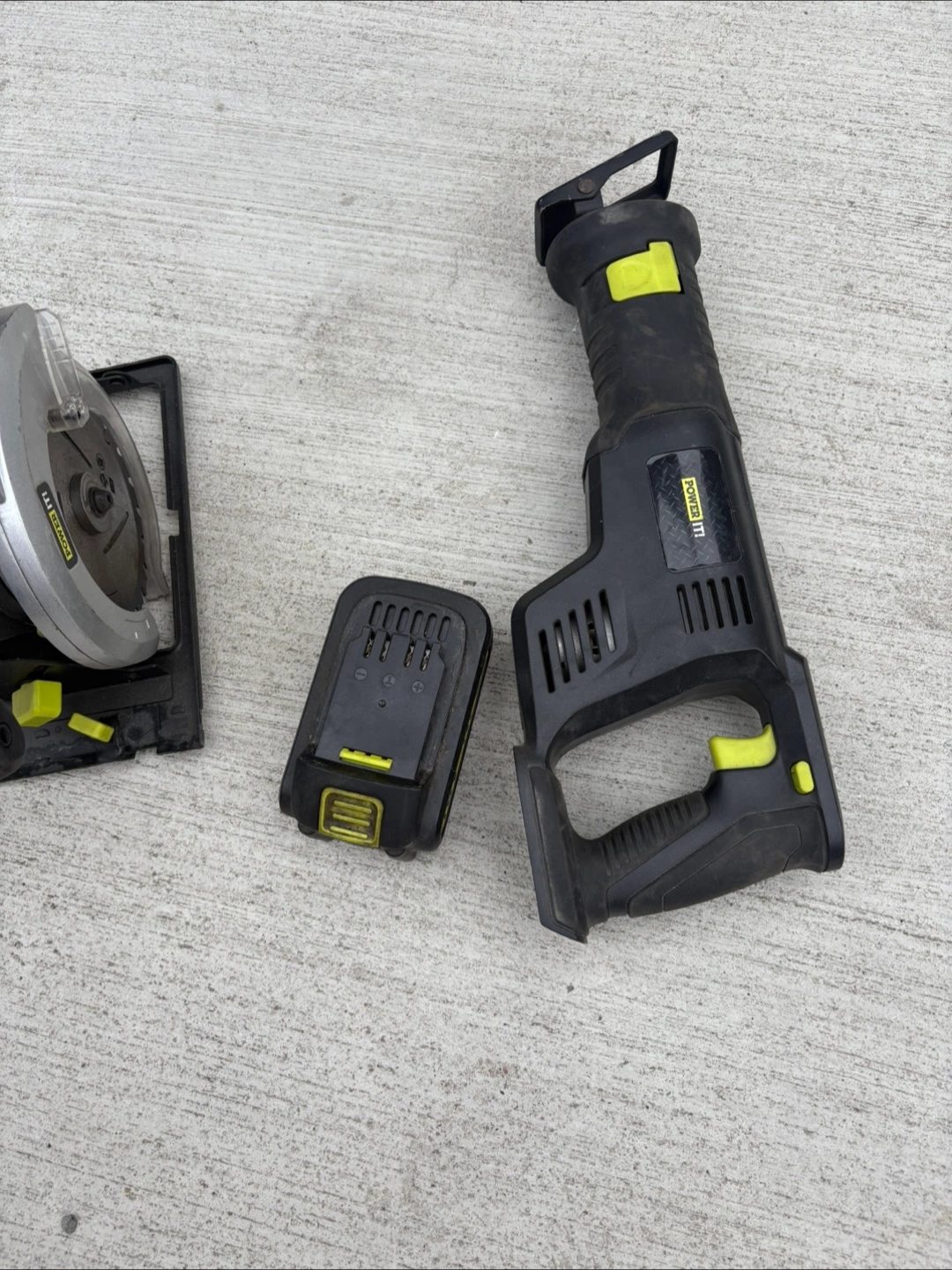 Comes with a circular saw, reciprocating saw, and a battery pack. Saws have a black and yellow design. These items can be used to build something amazing and relax your mind. I lost the charger that’s why am selling it, other than that everything is fine