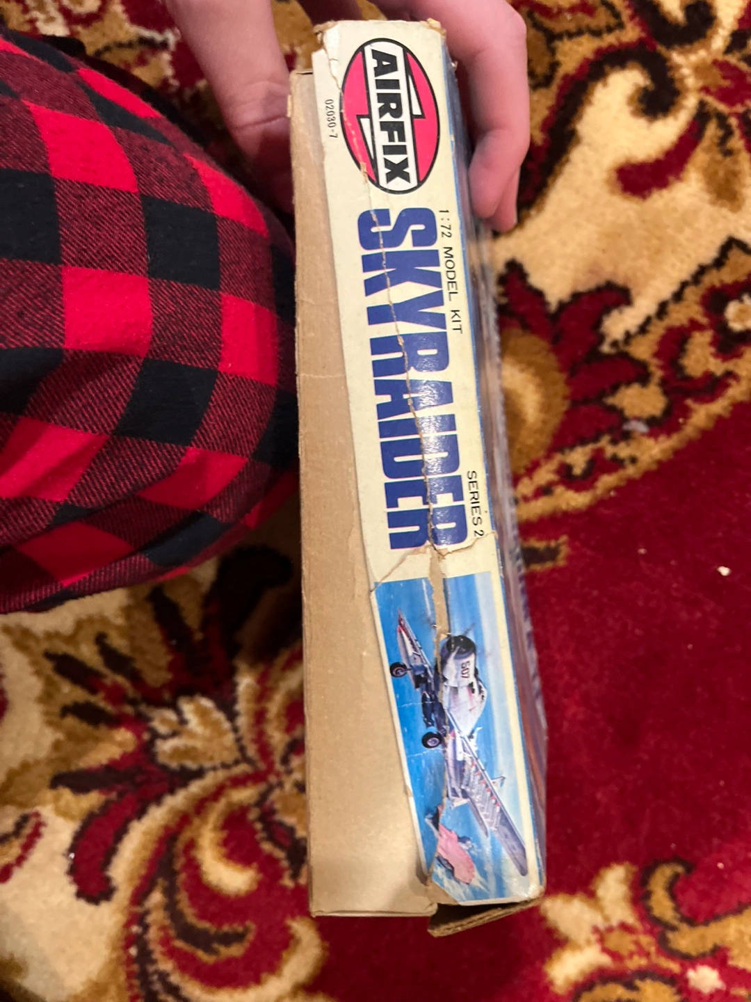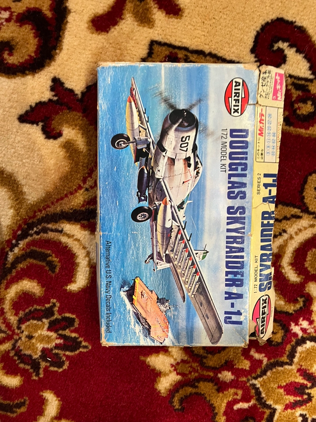 Model kit with an image of an airplane. Comes in a box with the Skyraider name. Can be relaxing to build and paint this model.