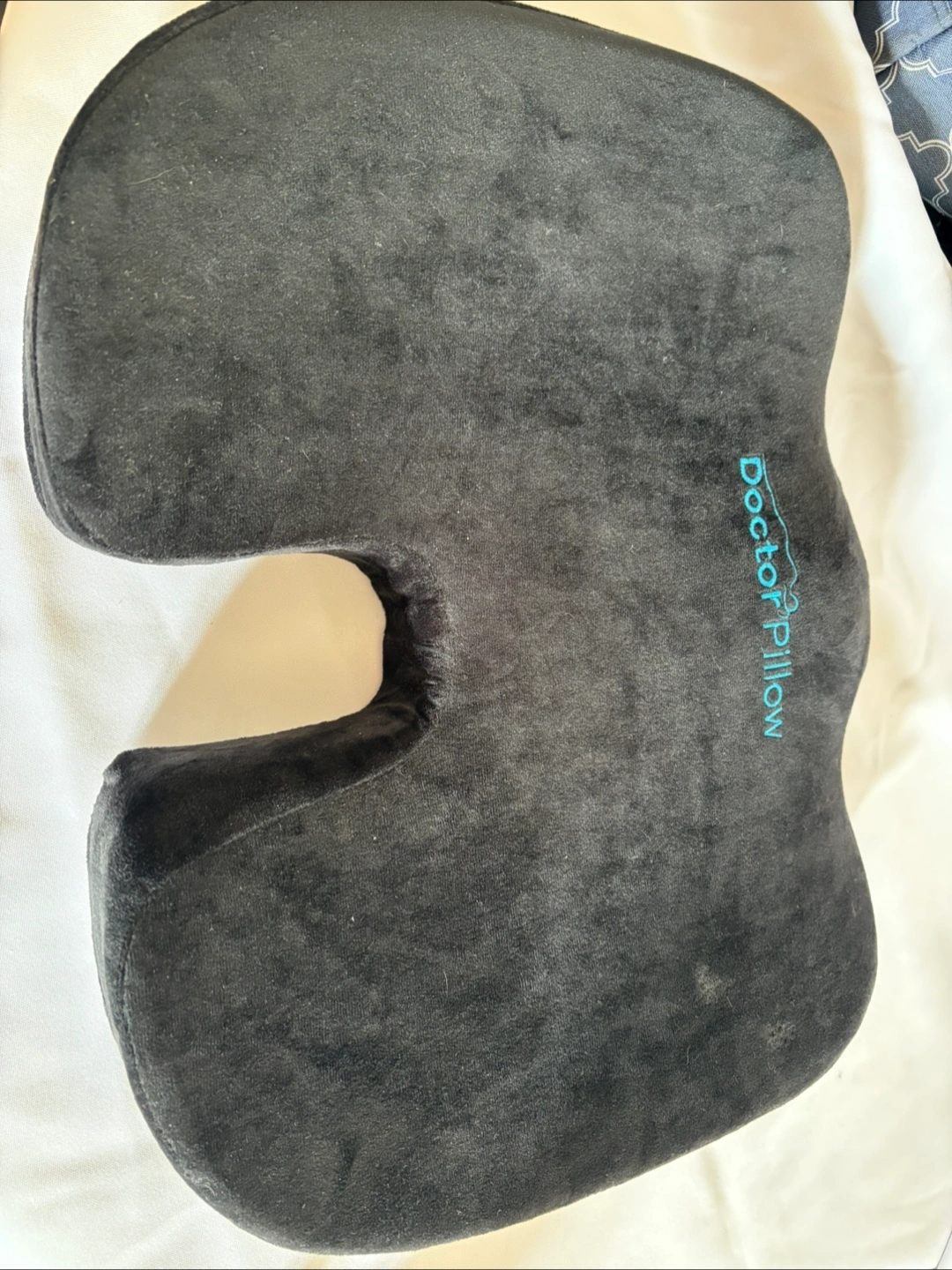 Cushion for support and comfort while sitting. It can be perfect for those moments when you want to relax and unwind. The cushion has a black top and white bottom with tiny holes all over. The edges are black.
