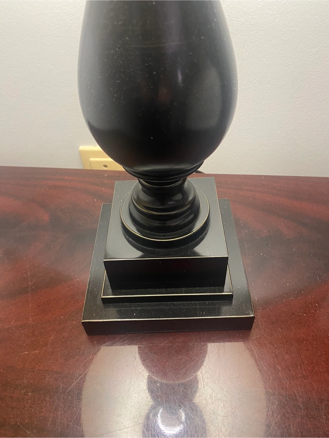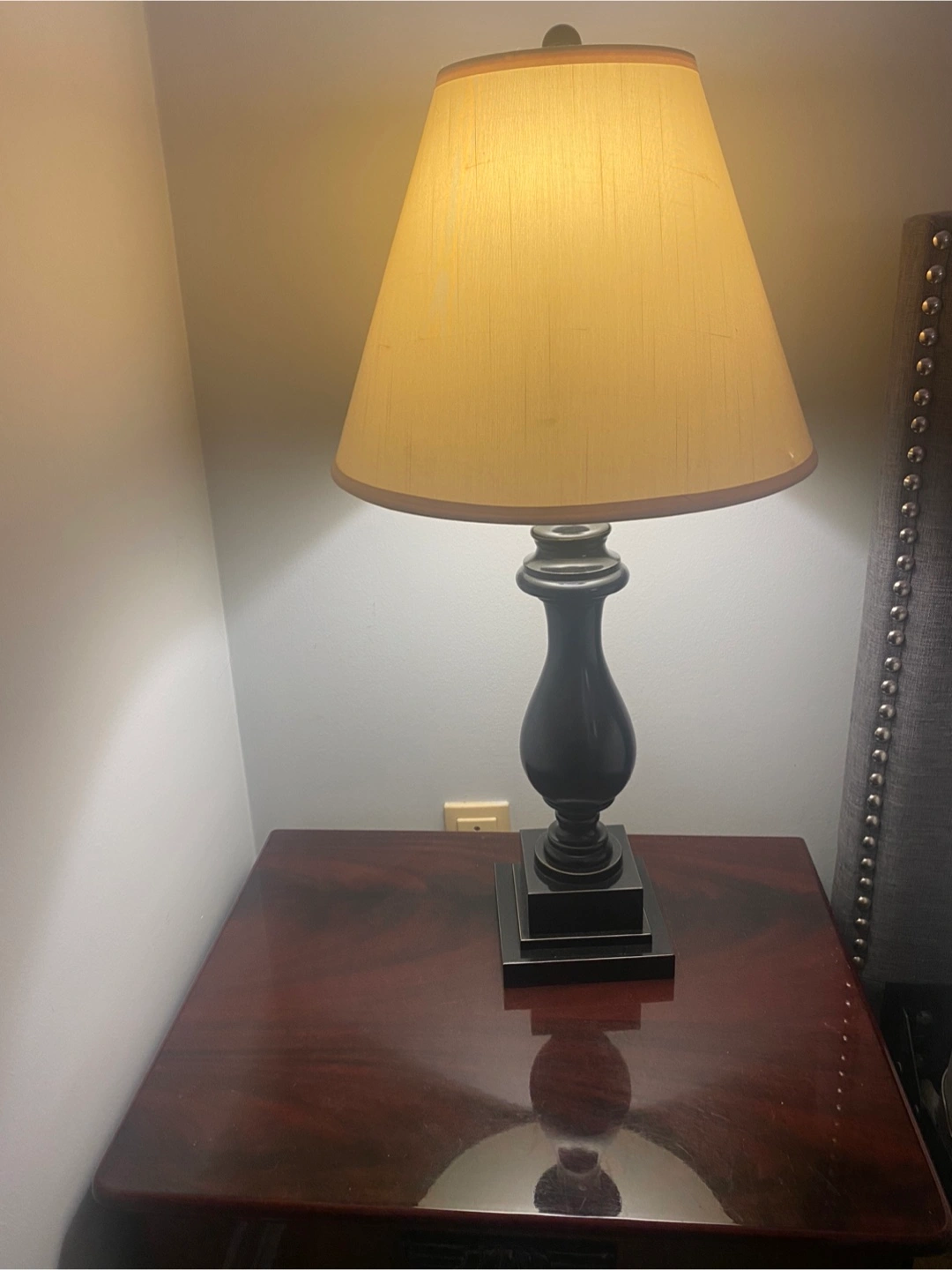 Two stylish table lamps. Features a dark, ornate base and a light-colored shade. Perfect for your bedside table to create a relaxing atmosphere at the end of the day. 2 for $40
