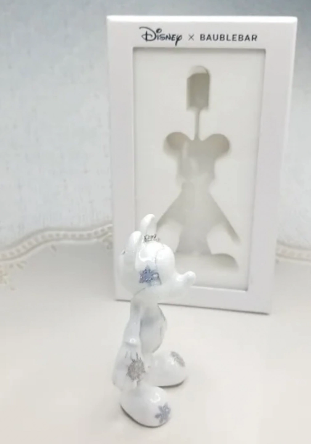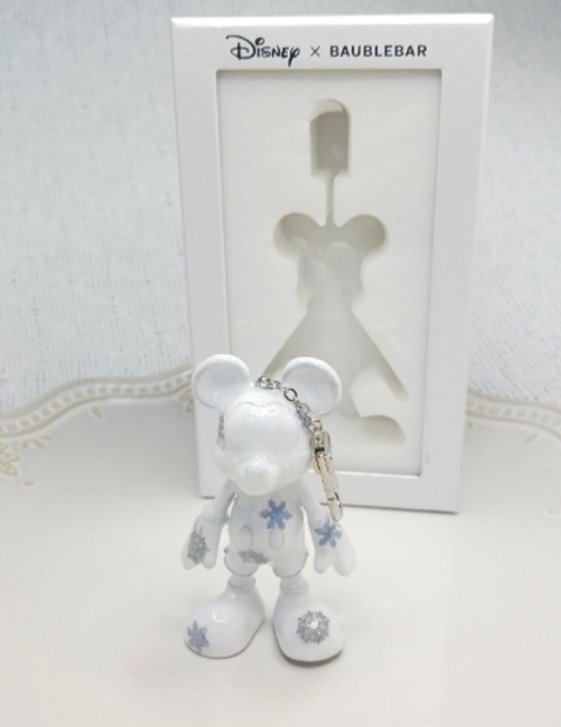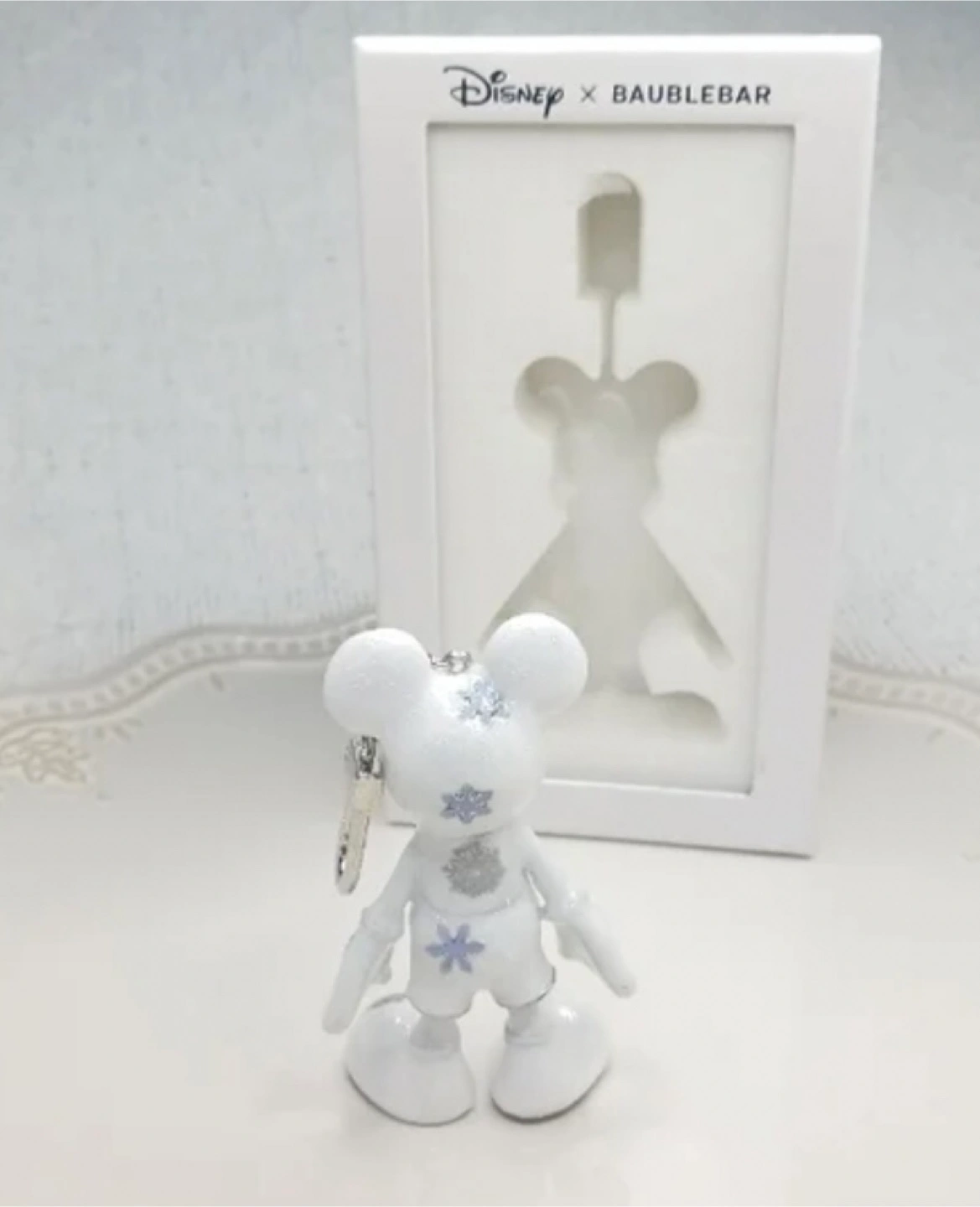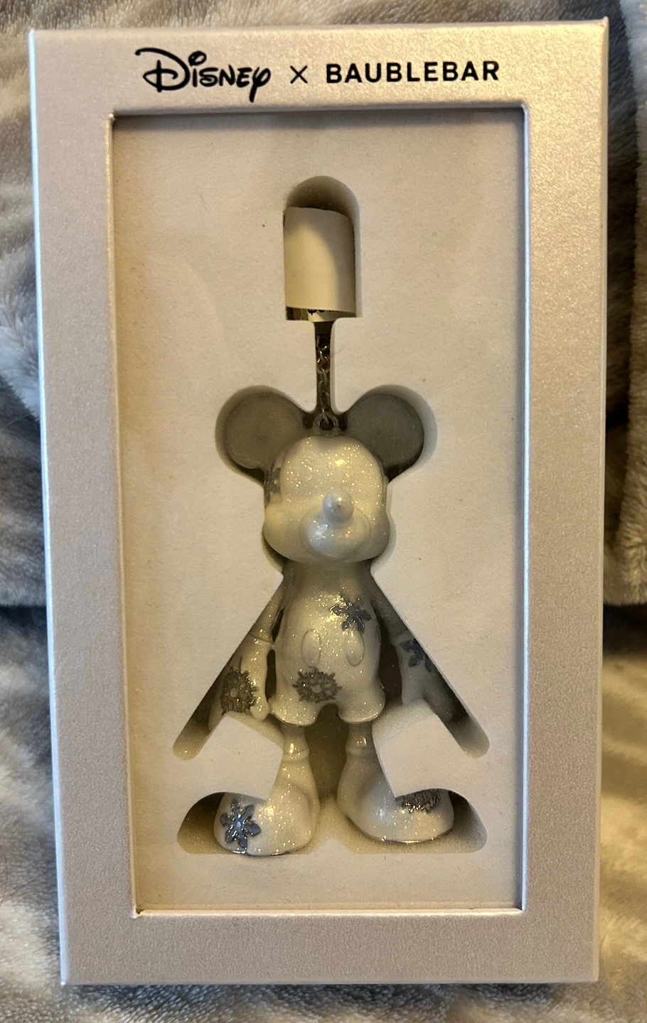 Mickey Mouse ornament in white. Detailing with silver accents. Comes in the original box. Can be used as an ornament or keychain, or bag charm 🤩