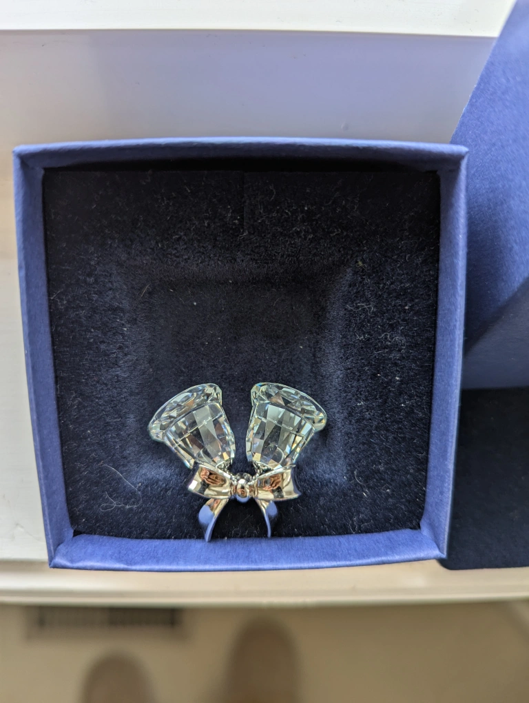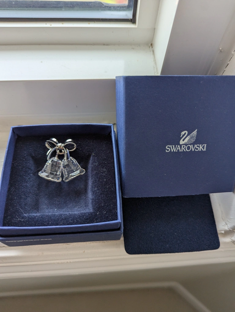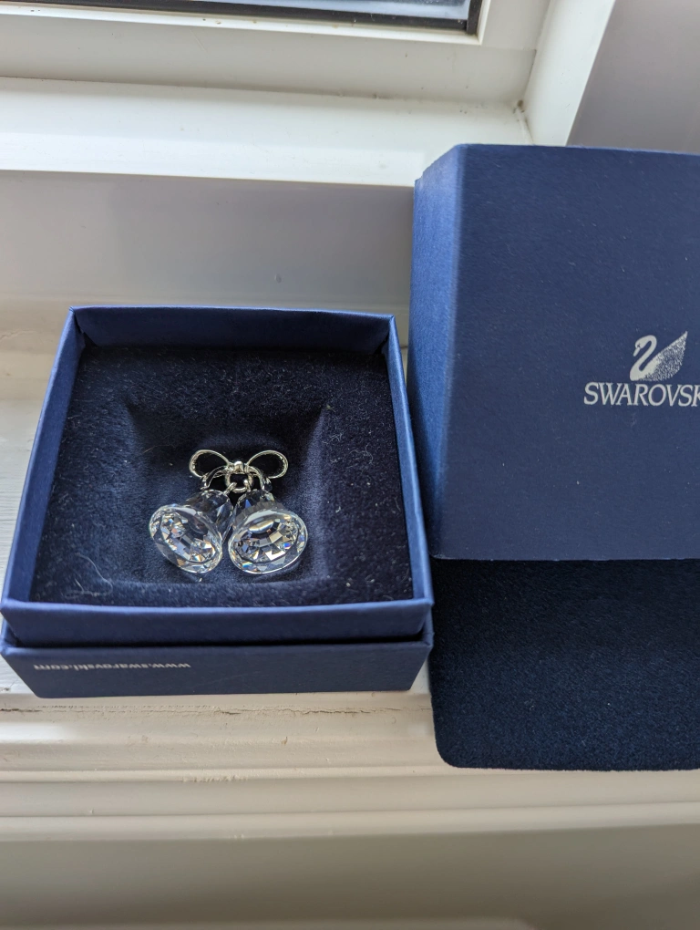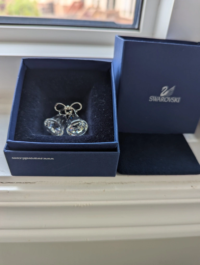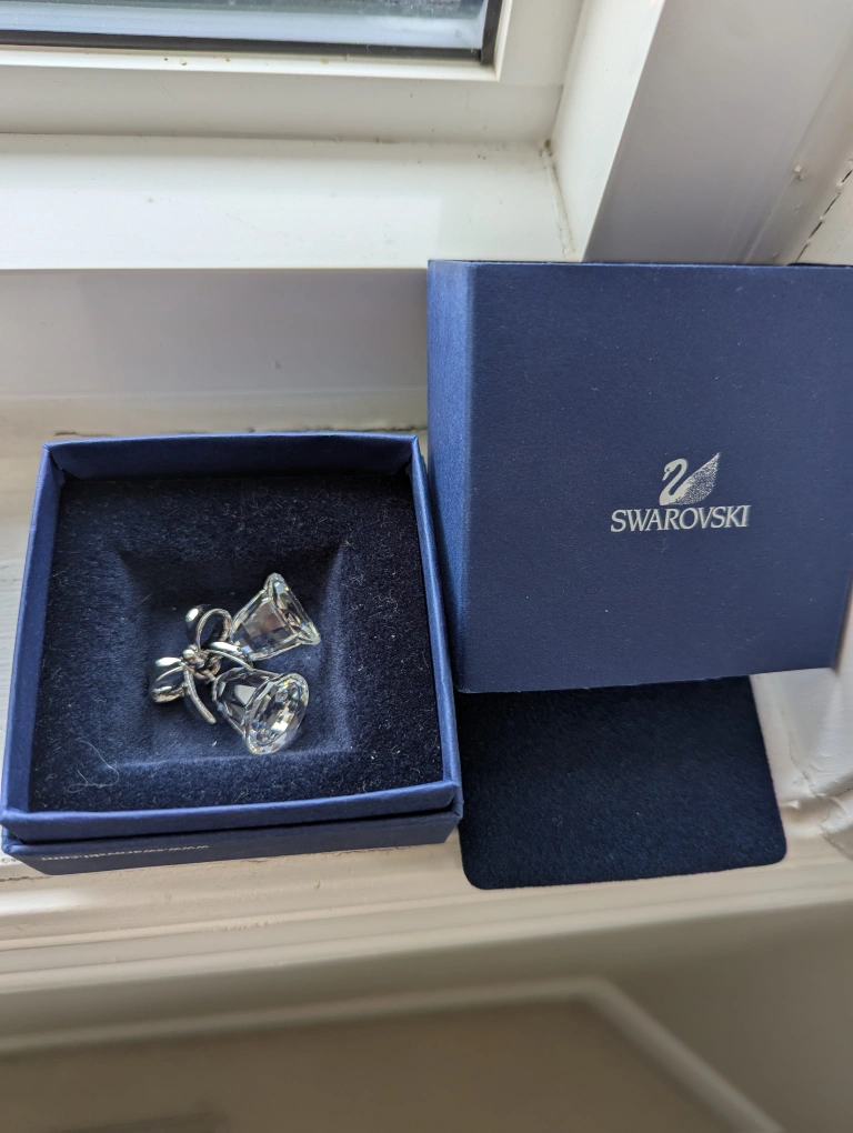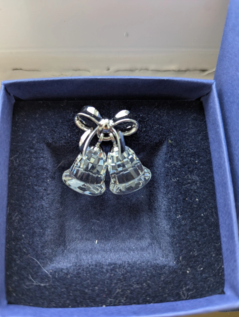 Here's a lovely crystal ornament, perfect for adding some subtle sparkle to any space. Featuring two crystal bells connected by a Rhodium plated bow. It can also be worn as a beautiful pendant.