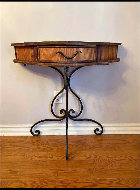 A console table, featuring a half-moon shape with a wooden top and a drawer. Woven details can be seen. The table has a metal base with elegant curves. This table would look lovely in your entry way to keep your keys organized.
