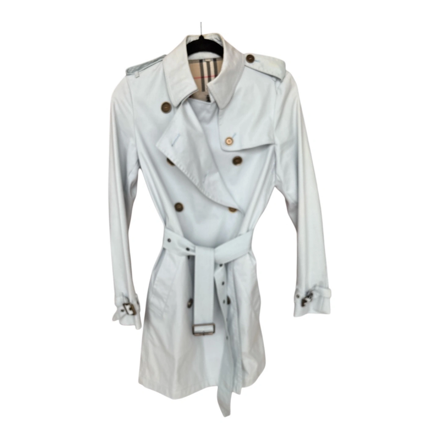 A beautiful Burberry light blue trench coat. Double-breasted, with a belt at the waist. Features button detailing. The inside of the coat has Burberry signature plaid. Made in England. Similar style priced over $3000 on Burberry official site. A bit of colour fading around the collar area as shown in last photo. Please note that they did note label size Small on the jacket, feel free to ask for exact measurements if interested. Wearing this coat will surely make you feel more confident. Feel free to contact for product details.