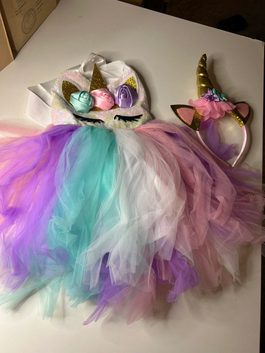 34Adorable unicorn dress with matching accessories. Includes a dress & headband only. Great for dress-up and imaginative play. Size 2T. New