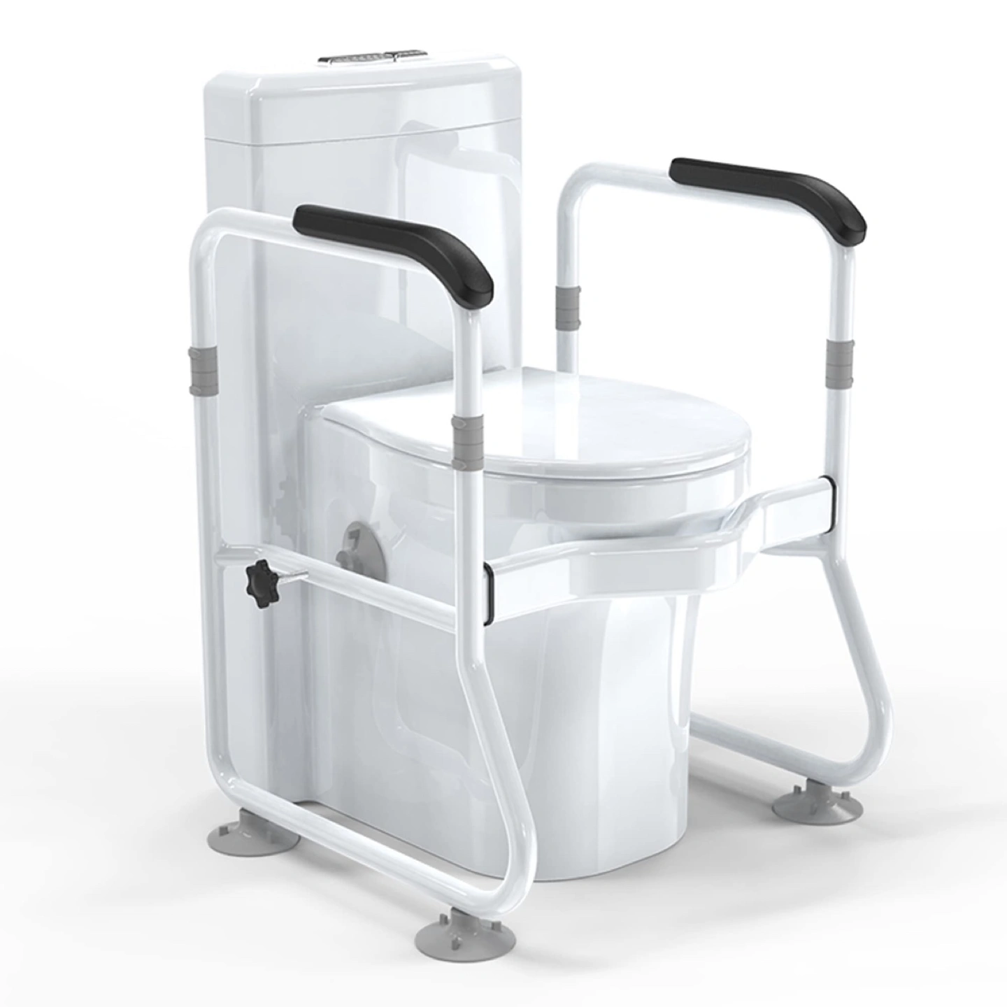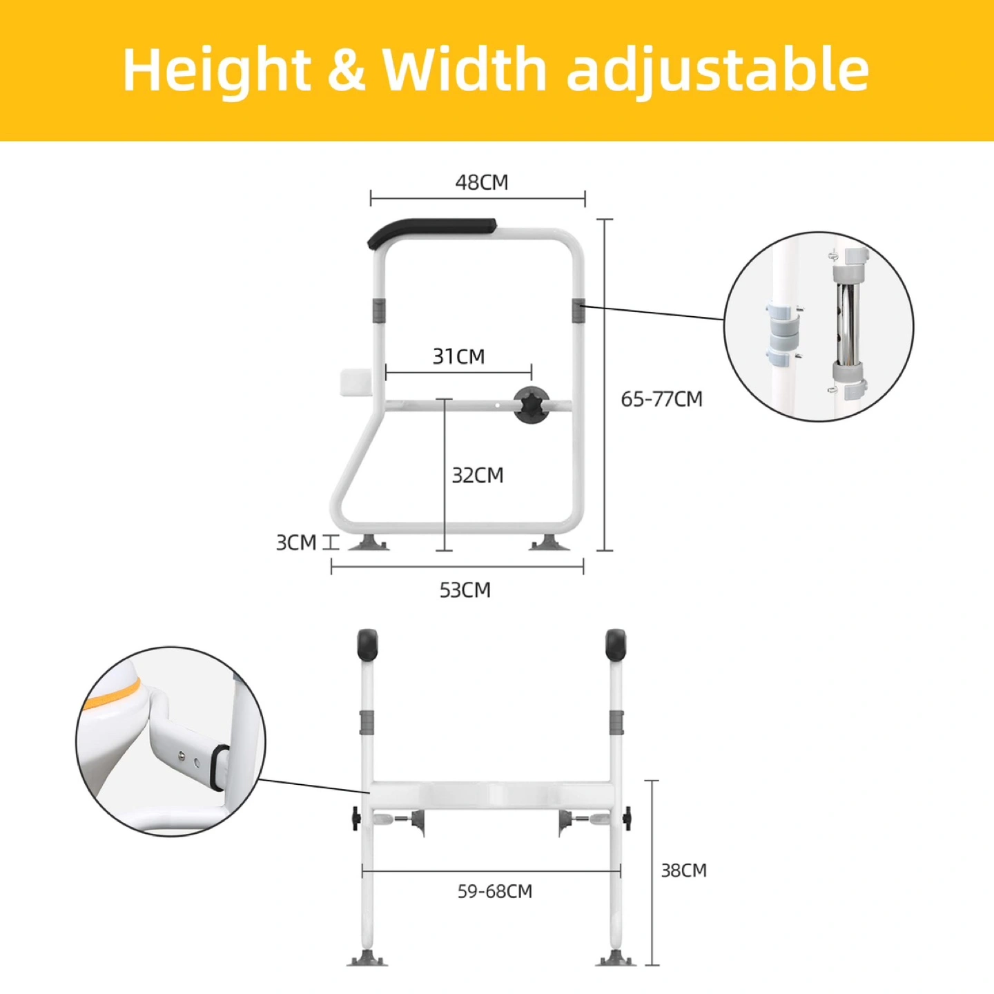 Brand TKING Material Carbon Steel Item weight 6.22 Kilograms Product Dimensions 77L x 68W Centimetres Style Modern Finish type Powder Coated ADJUSTABLE: The safety toilet rail has 4 levels of height adjustment and width adjustment range is 25"-30" | Fits all standard sized toilets. EASY TO CLEAN: carbon steel frame is durable and does not rust | Supporting up to 300 pounds and perfect for long term use. NO TOOLS REQUIRED: Works with all types of commodes and toilets, it can also be used in other parts of the house. SIT AND STAND SAFELY: The overall closed-loop design is stable and not deformed | you can also use it with one hand. WIDE RANGE OF APPLICATIONS: Perfect for seniors, arthritis sufferers and for those recovering from injury or surgery, the rail provides additional stability to prevent harmful slips and falls.