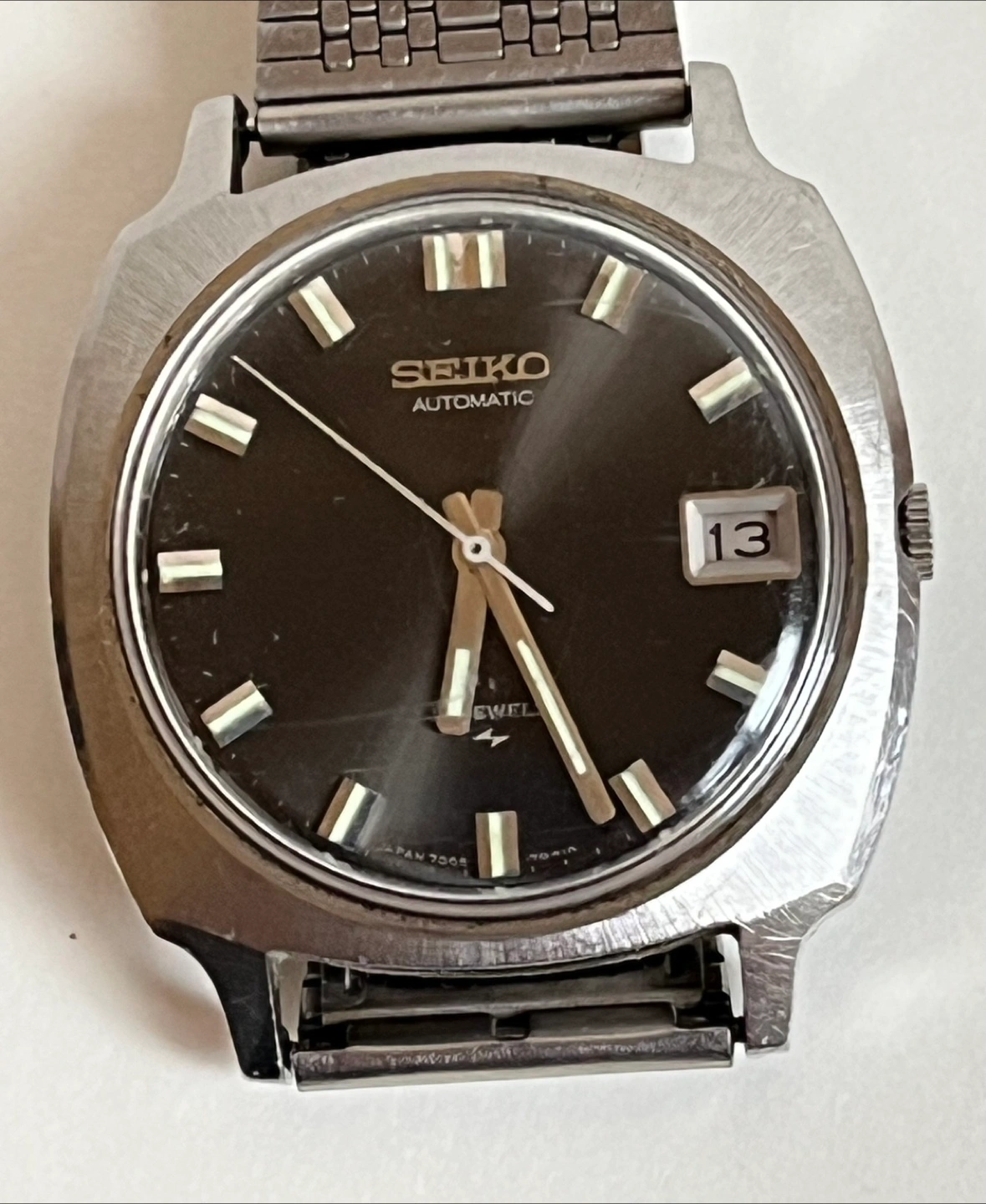 A vintage watch with a dark face. The watch has a date display window at the three o'clock position. It also features a metallic band. Watching the hands move on this watch could bring you a sense of serenity.