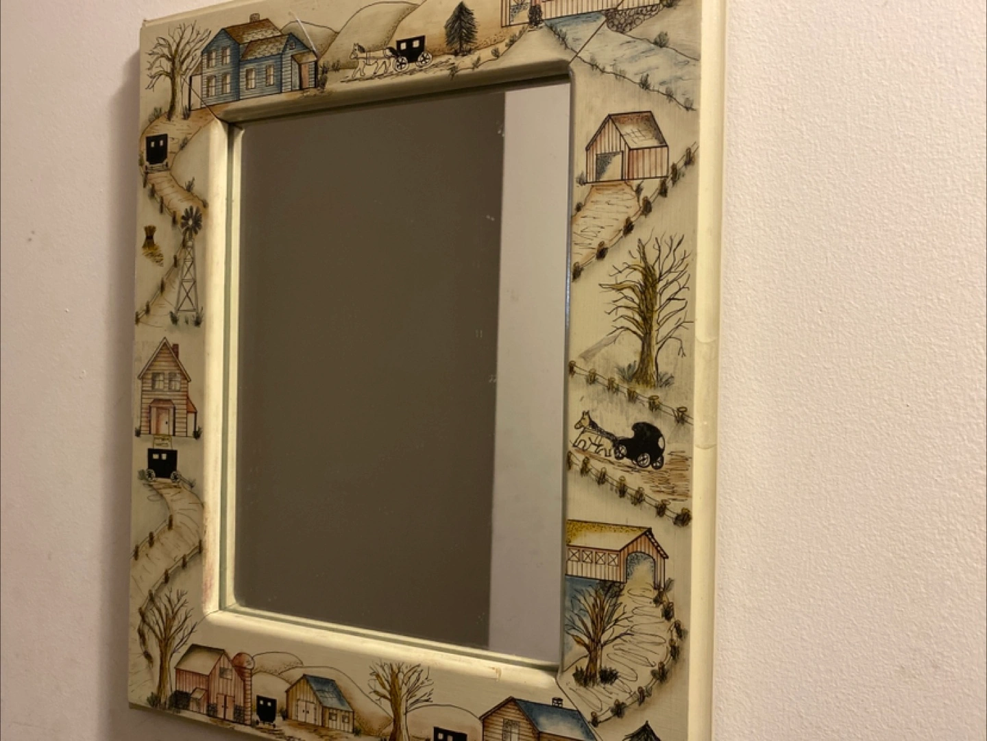 8614.5 / 17.5 inches mirror. Features a painted frame with a village scene design. Can be used for checking your makeup in a bedroom, or Living Room and any other place where you want to see beauty.