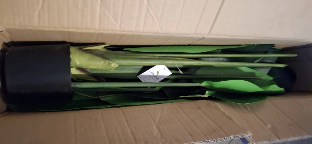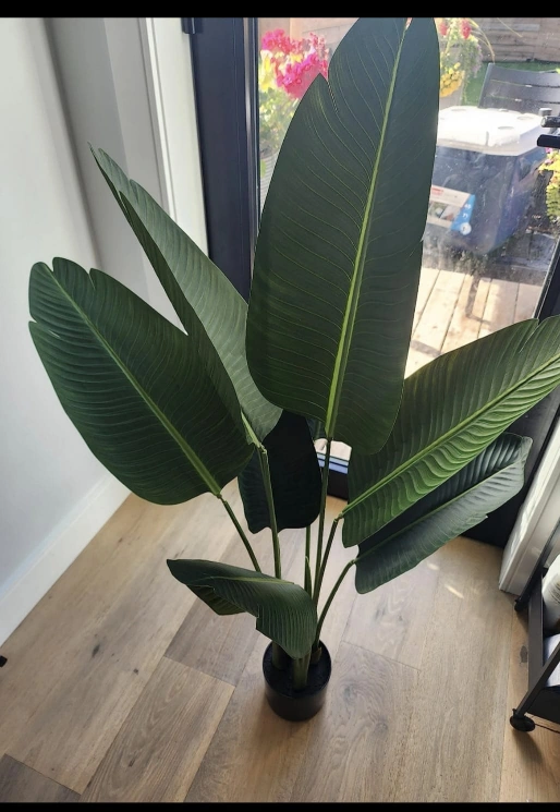 beautiful Bird of Paradise artificial plant. A decorative plant, in a black pot. The plant has a number of green leaves. This plant would look fantastic in a sunny living room.