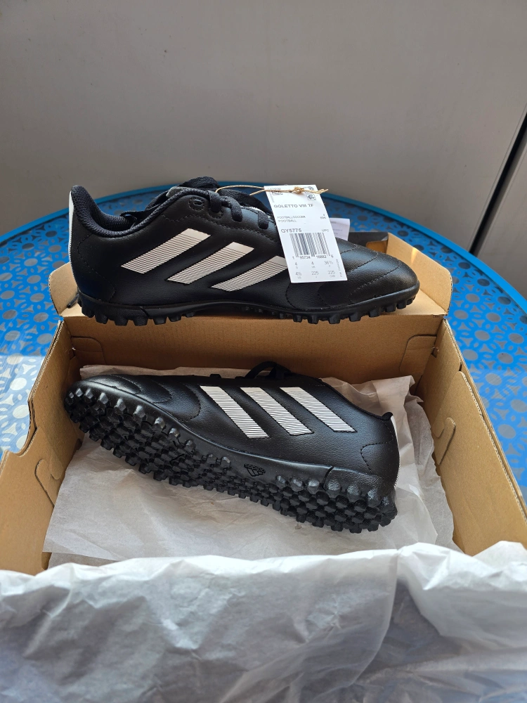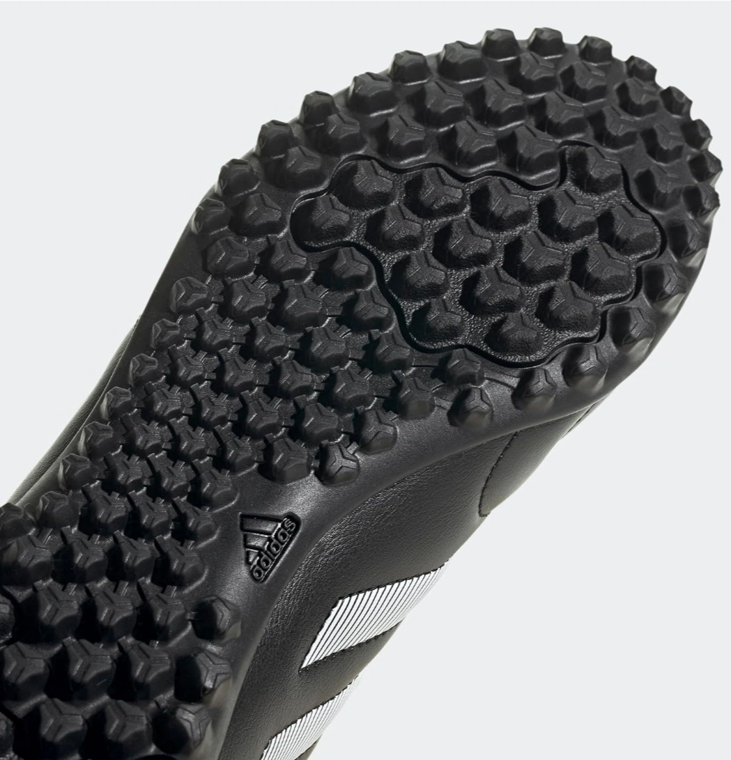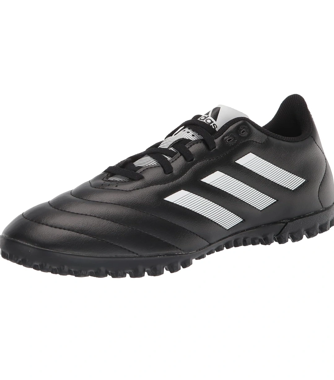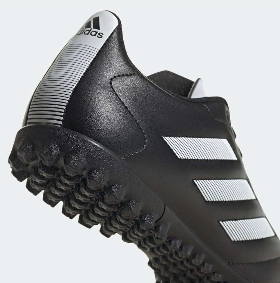A pair of black soccer cleats with white accents. Features a sole made of many small nubs. The Adidas logo on the heel. These cleats are perfect for when you want to go play some soccer with your friends.