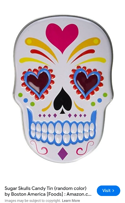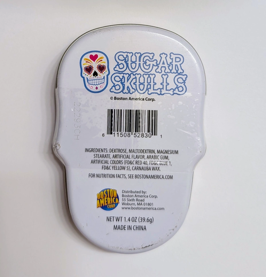 982This item is Brand New and still wrapped. The front sugar skull design is eye catching. The back has information on ingredients and the brand. It is a a great collector tin to keep items you don't want to lose in. π