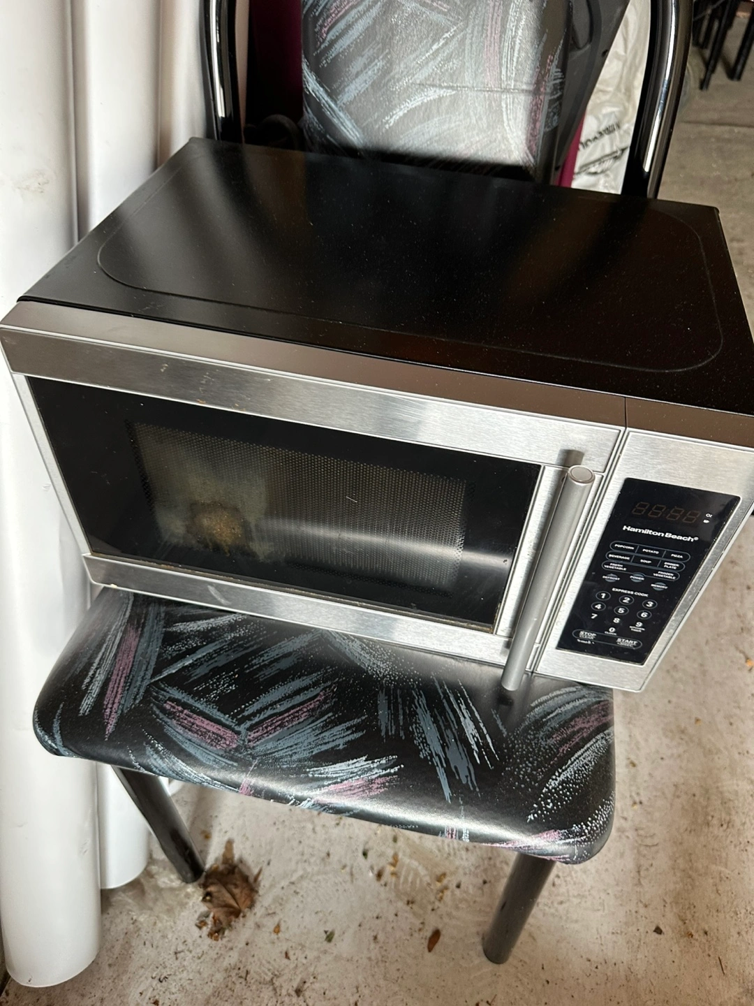 A microwave oven, black and silver in colour. Features a digital clock and a control panel. Includes a rotating glass plate. Perfect for quick and easy meal prep after a long day. Just need a clean up and it works perfectly fine , pick up only