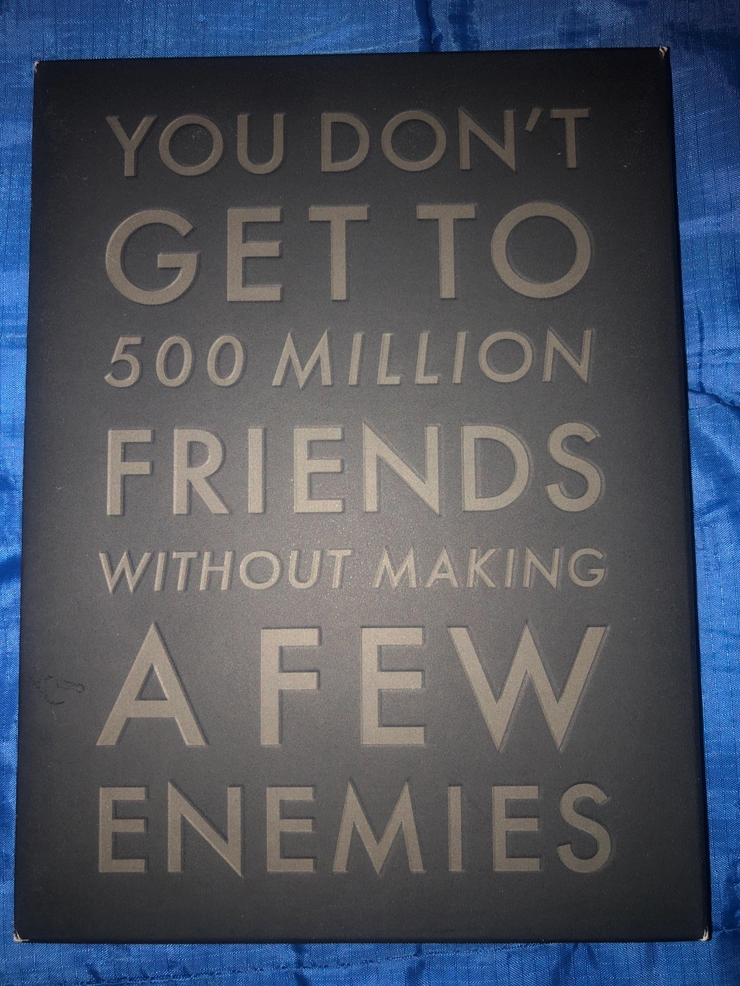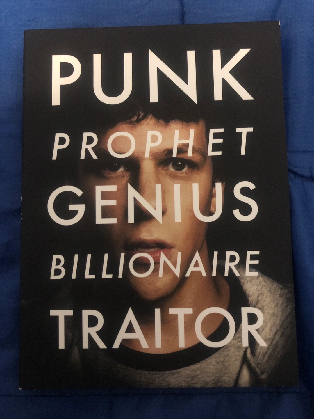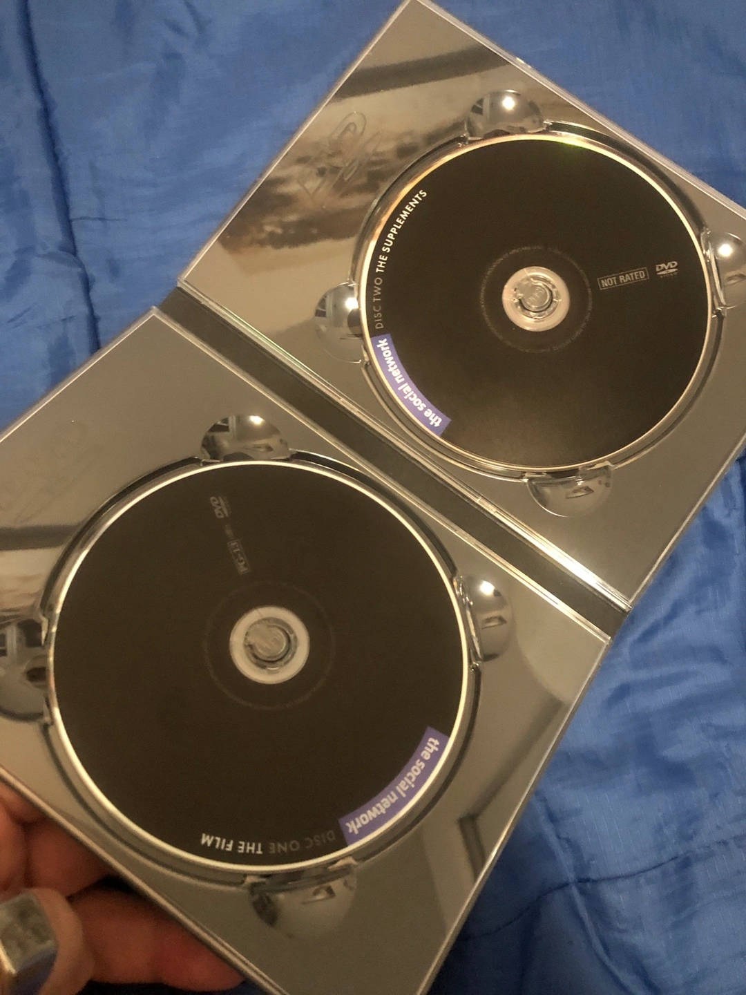 A copy of The Social Network on DVD. The box shows many pictures, and the title of the movie is displayed on the front cover. Watching this will transport you.