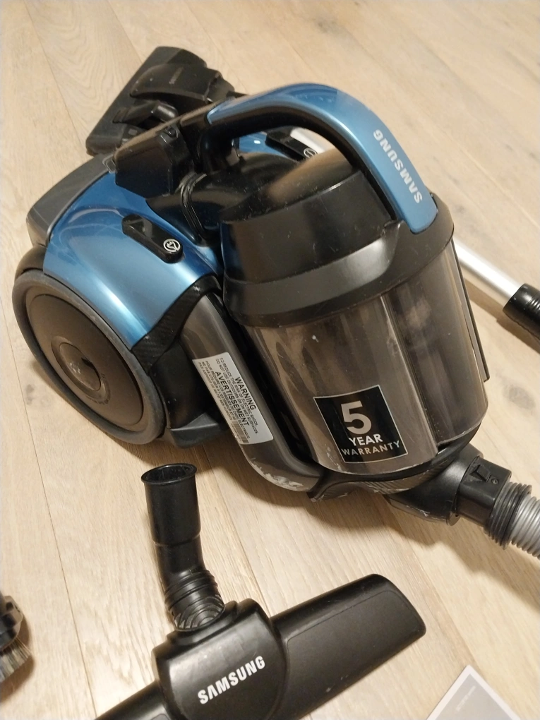 A quality vacuum cleaner with attachments. Features a dust container and a hose. A great item for keeping your home tidy and peaceful. Comes with a user manual.