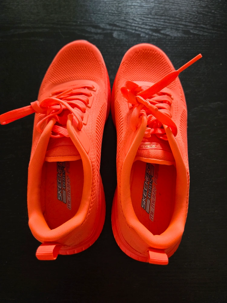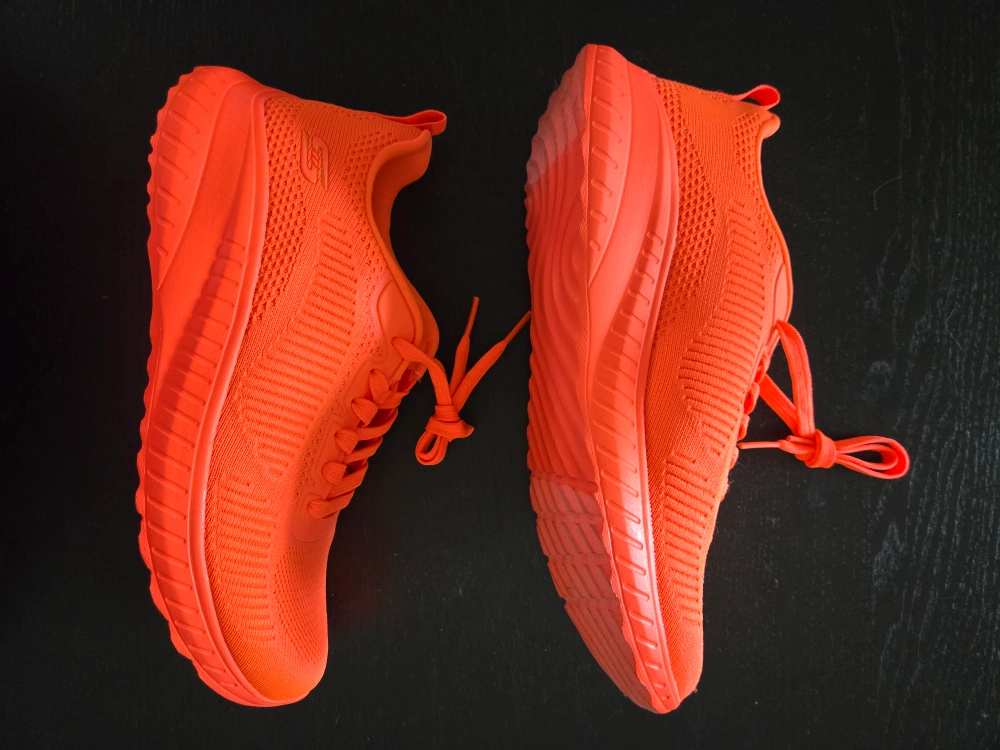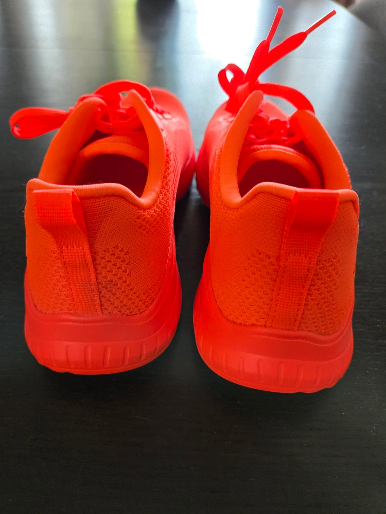 Vibrant orange sneakers. Mesh fabric and matching laces. Memory foam supported. These shoes have a sporty design. Perfect for a leisurely walk in the park and great visibility at night.