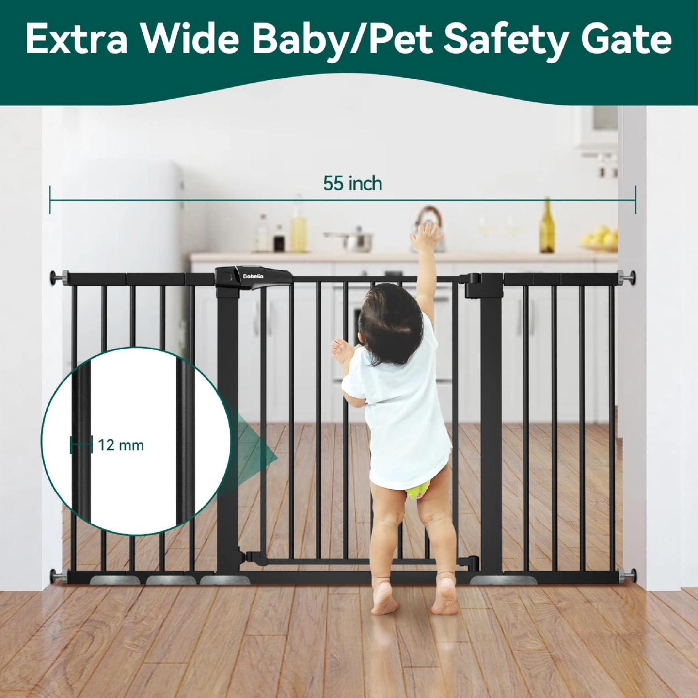 275GOOD DESGIN — The Babelio extra wide baby gate for stairs is made of all-steel structure, it can withstand impacts from pets. You do not need to worry about baby gates with door being pushed down and hurting your children. Meanwhile, the dog gate can also prevent your kids and pets from squeezing through because the measurement between the bars is only 2.17 Inch. ADJUSTABLE SIZE & EXTRA WIDE — The pet gate consists of a gate and 4 extensions. The maximum width is 55 Inch, while the minimum is 29 Inch (without extensions), ideal for wide openings as well as stairs, hallways and doorways to protect children and pets. Please measure your opening prior to purchasing to ensure the gate fits properly. EASY TO INSTALL — Pressure mount designed allow you to install quickly and disassembly with included kit, no additional tools required and no need to punch holes in the wall. Wall Protactor equipped will protect your wall from damage. You can remove it anytime when it is not in use. Of course, this baby gate can be reused. AUTO CLOSE & ONE HANDED RELEASE — The safety gate is equipped with double lock design and auto-close function. The adults can be easily opened by one-handed operation, free to go through from both sides. But it's hard for a baby to open the gate. Auto-close feature that gently closes the gate and a stay-open feature that keeps it open. WHAT YOU GET — Includes 1* 11 inch wide extension kits, 2* 5.5 inch wide extension kits, 1* 2.75 inch wide extension kits and 4* wall protectors. There will be a fastening strap between the latch and the frame. Please fully assemble and fix the 4 bolts to the door first, and then cut the fixing strap.