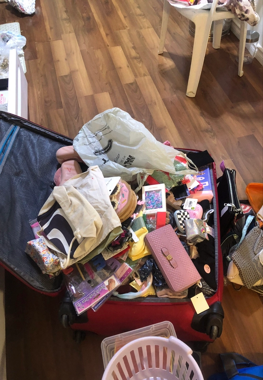 Open suitcase, packed with many items. Several items are visible, like purses and a small basket. This suitcase (not for sale) .